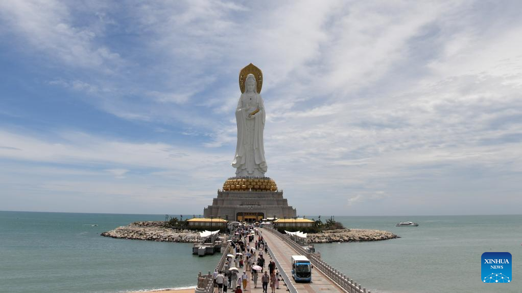 Tourists visit the Nanshan Cultural Tourism Zone in Sanya, south China's Hainan Province, Aug. 27, 2025. After Typhoon Kajiki swept through, Sanya City has been moving swiftly to restore its tourism market. (Xinhua/Zhao Yingquan)