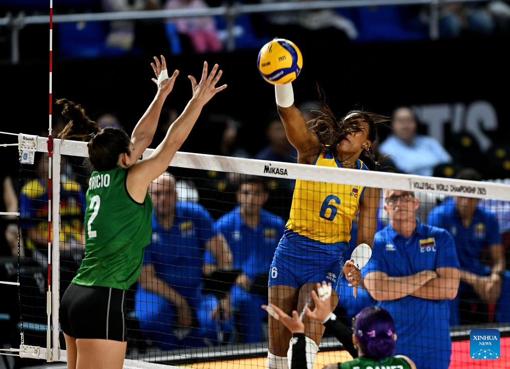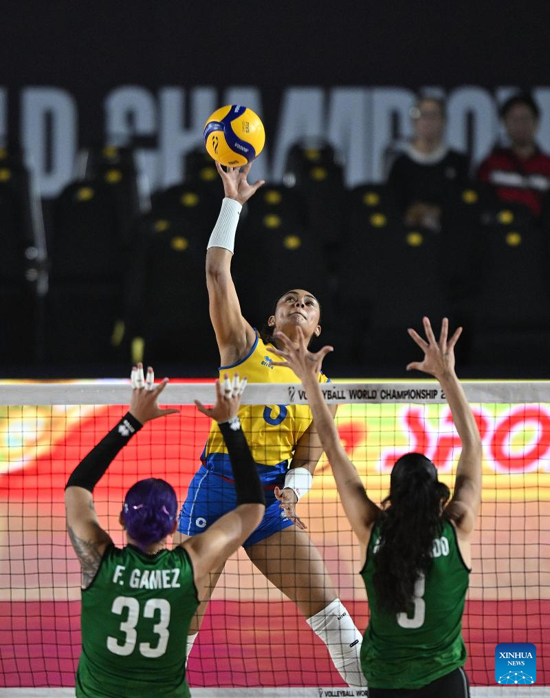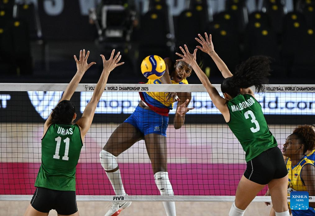 Ana Karina Olaya Gamboa (C) of Colombia spikes the ball during the Preliminary Phase Pool F match between Colombia and Mexico at the Volleyball Women's World Championship in Chiang Mai, Thailand, Aug. 27, 2025. (Xinhua/Hou Zhaokang)