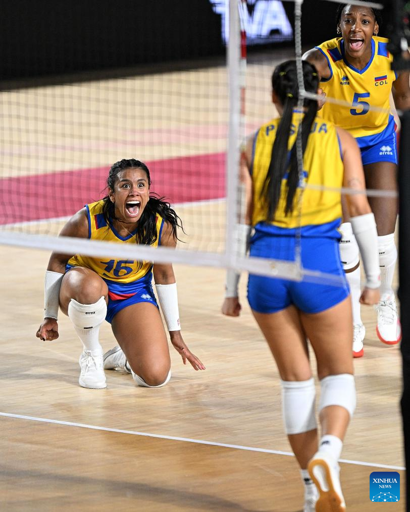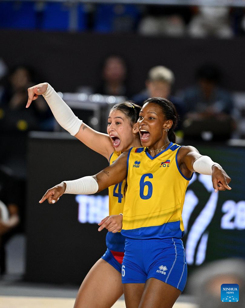 Maria Alejandra Marin (L) of Colombia celebrates scoring with teammates during the Preliminary Phase Pool F match between Colombia and Mexico at the Volleyball Women's World Championship in Chiang Mai, Thailand, Aug. 27, 2025. (Xinhua/Hou Zhaokang)