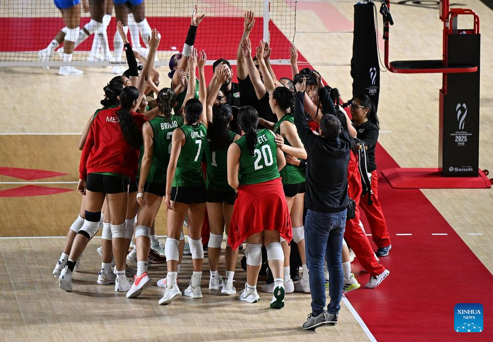 Players of Mexico celebrate victory after the Preliminary Phase Pool F match between Colombia and Mexico at the Volleyball Women's World Championship in Chiang Mai, Thailand, Aug. 27, 2025. (Xinhua/Hou Zhaokang)
