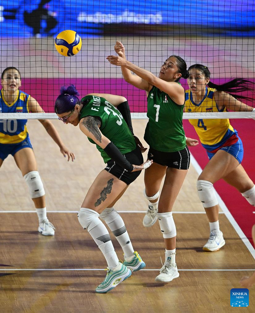 Gloria Argentina Ung Enriquez (2nd R) of Mexico competes during the Preliminary Phase Pool F match between Colombia and Mexico at the Volleyball Women's World Championship in Chiang Mai, Thailand, Aug. 27, 2025. (Xinhua/Hou Zhaokang)