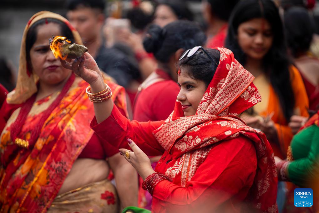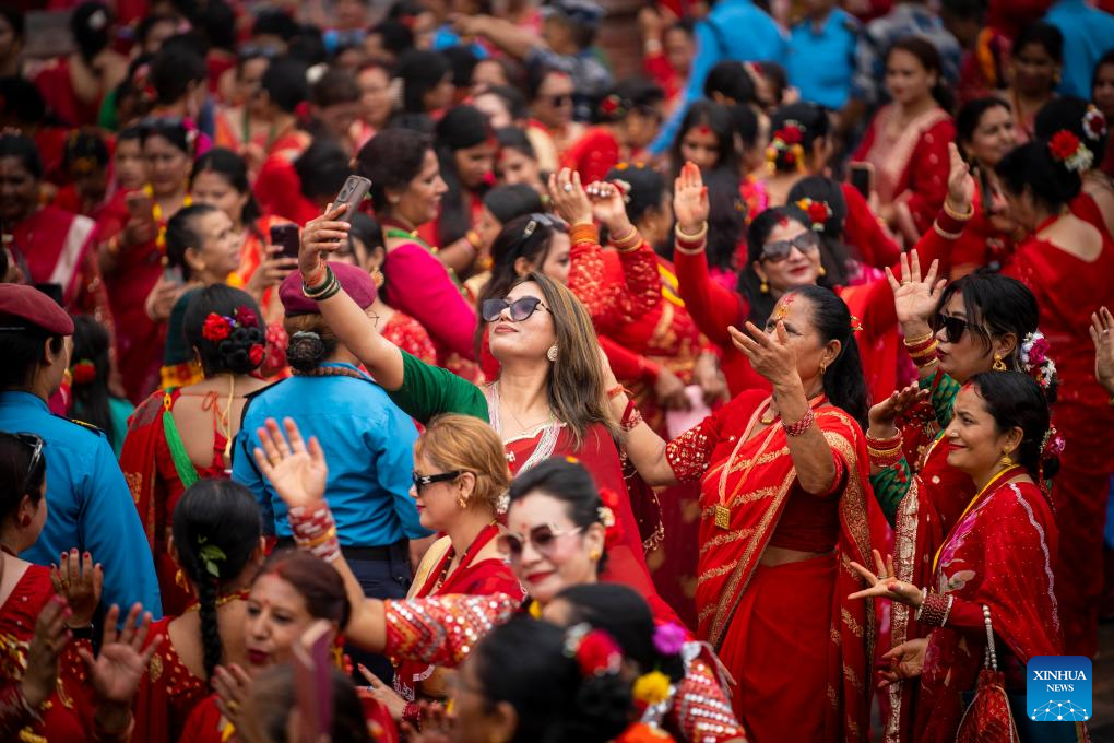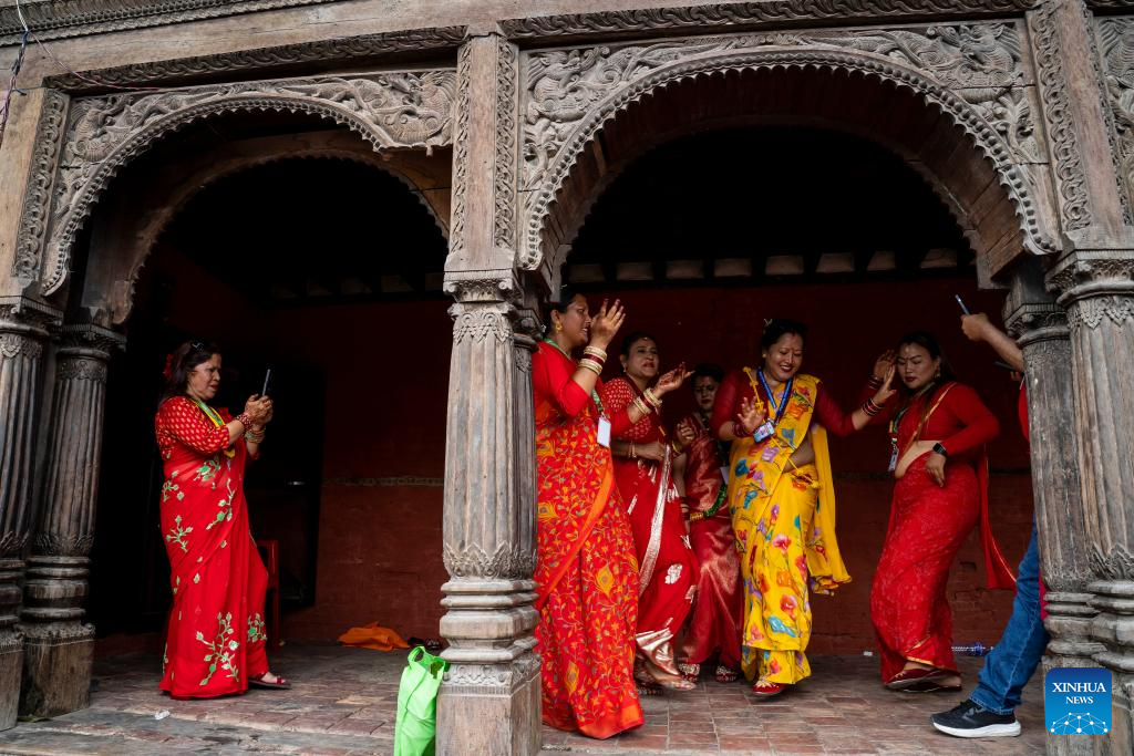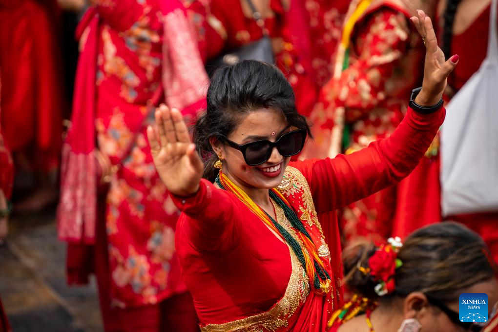 Women celebrate the Teej Festival at the Pashupatinath Temple in Kathmandu, Nepal, Aug. 26, 2025. During the festival, married women fast and pray for good health and longevity of their husbands and unmarried women pray for marrying ideal husbands. (Photo by Hari Maharjan/Xinhua)