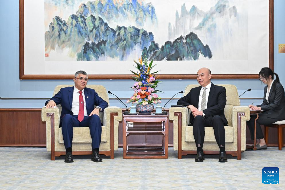 Chinese Vice Premier Liu Guozhong, also a member of the Political Bureau of the Communist Party of China Central Committee, meets with Abdulla Al Mandous, president of the World Meteorological Organization (WMO), in Beijing, capital of China, Aug. 27, 2025. (Xinhua/Yue Yuewei)