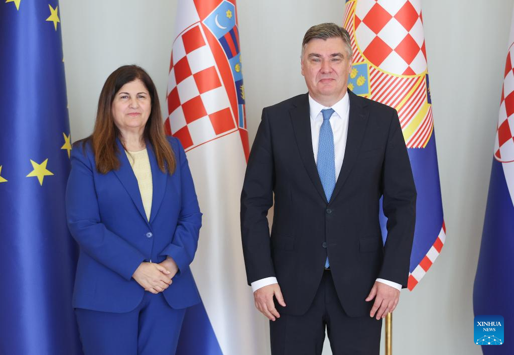 Croatian President Zoran Milanovic (R) meets with Varsen Aghabekian, Palestine's minister of state for foreign affairs and expatriates, in Zagreb, Croatia, on Aug. 27, 2025. (Sanjin Strukic/PIXSELL via Xinhua)