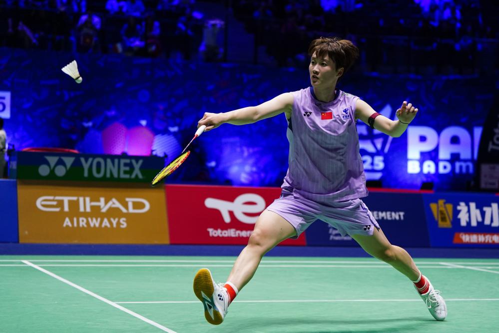 Chen Yufei hits a return during the women's singles second round match between Chen Yufei of China and Mia Blichfeldt of Denmark at the BWF World Championships 2025 in Paris, France, Aug. 27, 2025. (Xinhua/Peng Ziyang)