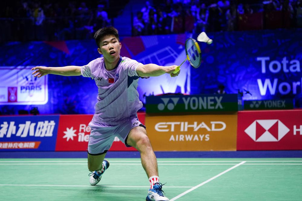 Weng Hongyang hits a return during the men's singles second round match between Weng Hongyang of China and Lee Chia Hao of Chinese Taipei at the BWF World Championships 2025 in Paris, France, Aug. 27, 2025. (Xinhua/Peng Ziyang)