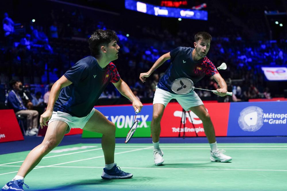 Ruben Garcia/Carlos Piris (R) compete during the men's doubles 1/16 match between Liang Weikeng/Wang Chang of China and Ruben Garcia/Carlos Piris of Spain at the BWF World Championships 2025 in Paris, France, Aug. 27, 2025. (Xinhua/Peng Ziyang)