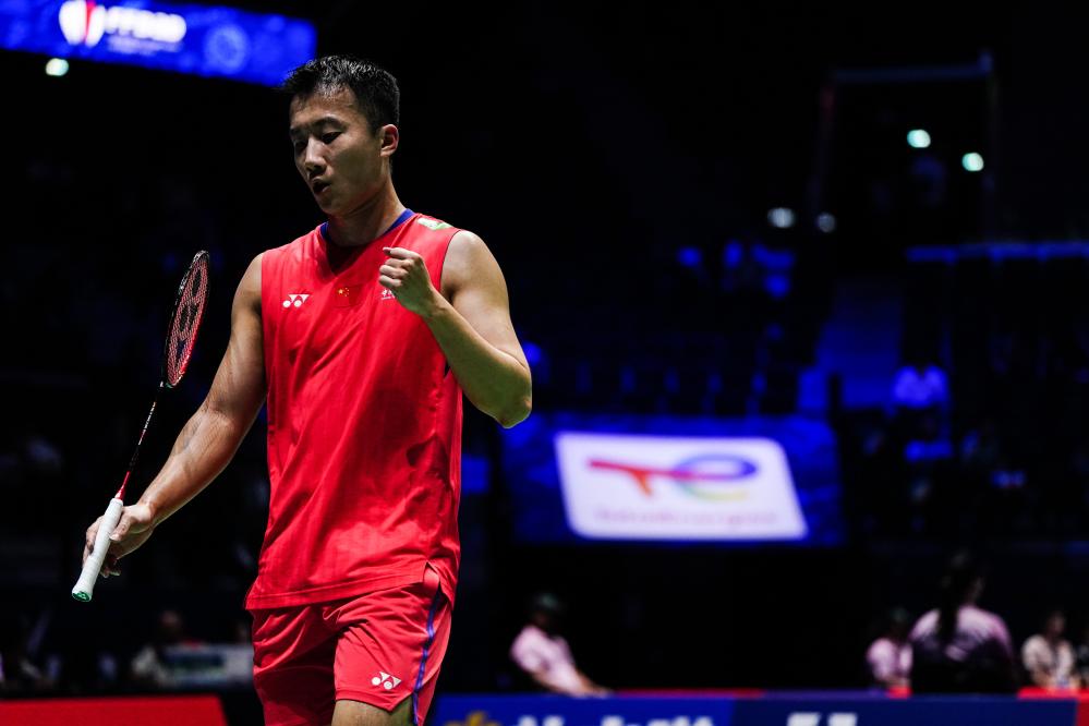 Lu Guangzu reacts during the men's singles 1/16 match between Lu Guangzu of China and Victor Lai of Canada at the BWF World Championships 2025 in Paris, France, Aug. 27, 2025. (Xinhua/Peng Ziyang)