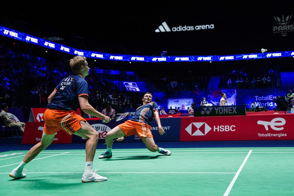 Jiri Kral/Ondrej Kral (L) compete during the men's doubles 1/16 match between Chen Boyang/Liu Yi of China and Jiri Kral/Ondrej Kral of the Czech Republic at the BWF World Championships 2025 in Paris, France, Aug. 27, 2025. (Xinhua/Peng Ziyang)