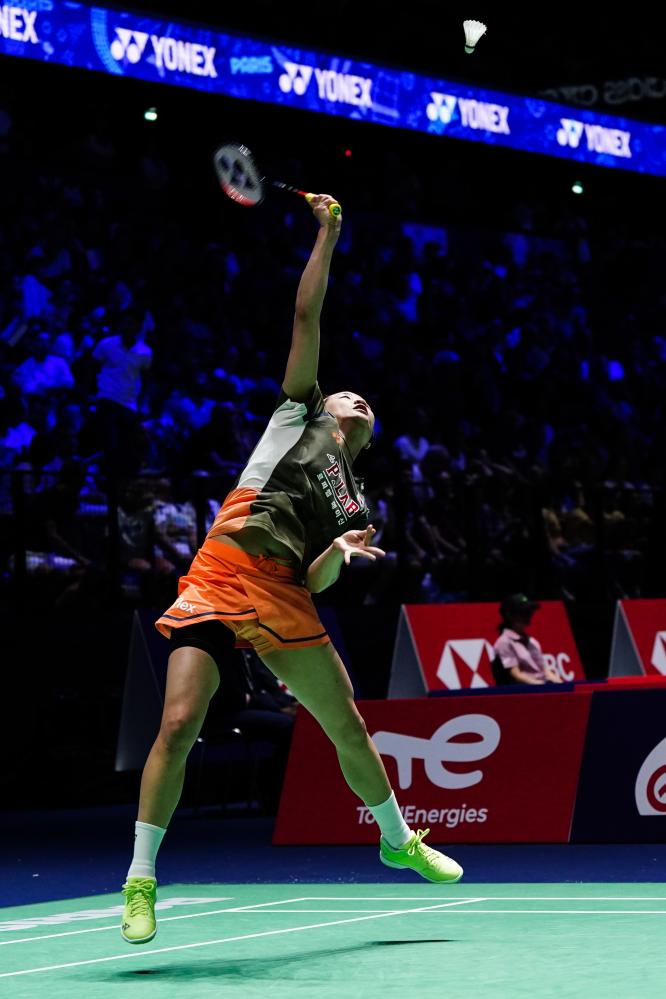 Wang Zhiyi reacts during the women's singles second round match between Wang Zhiyi of China and Lin Hsiang Ti of Chinese Taipei at the BWF World Championships 2025 in Paris, France, Aug. 27, 2025. (Xinhua/Peng Ziyang)