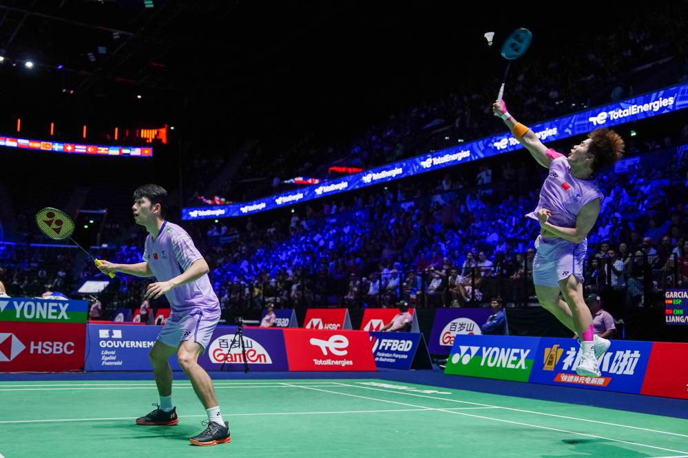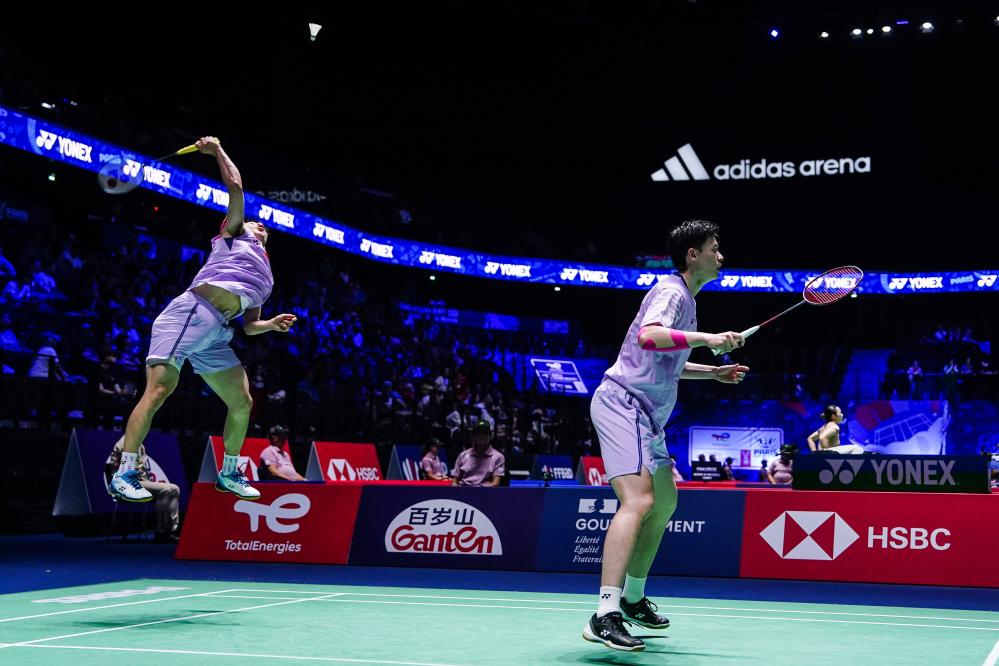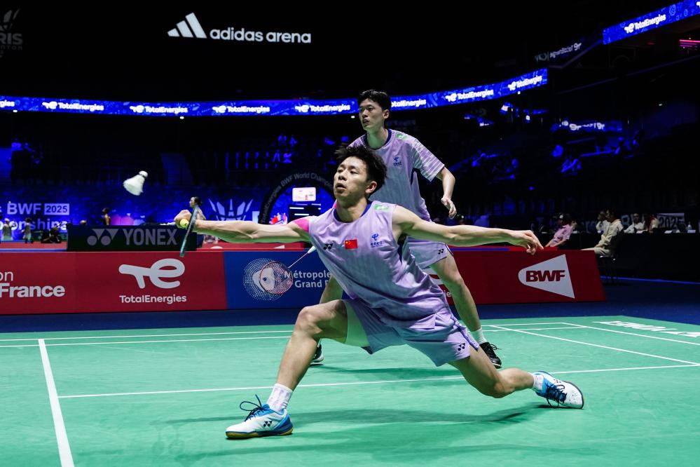 Chen Boyang/Liu Yi (front) compete during the men's doubles 1/16 match between Chen Boyang/Liu Yi of China and Jiri Kral/Ondrej Kral of the Czech Republic at the BWF World Championships 2025 in Paris, France, Aug. 27, 2025. (Xinhua/Peng Ziyang)