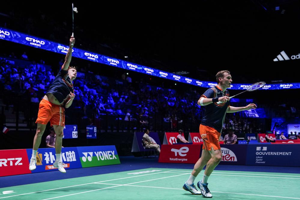 Jiri Kral (R)/Ondrej Kral compete during the men's doubles 1/16 match between Chen Boyang/Liu Yi of China and Jiri Kral/Ondrej Kral of the Czech Republic at the BWF World Championships 2025 in Paris, France, Aug. 27, 2025. (Xinhua/Peng Ziyang)