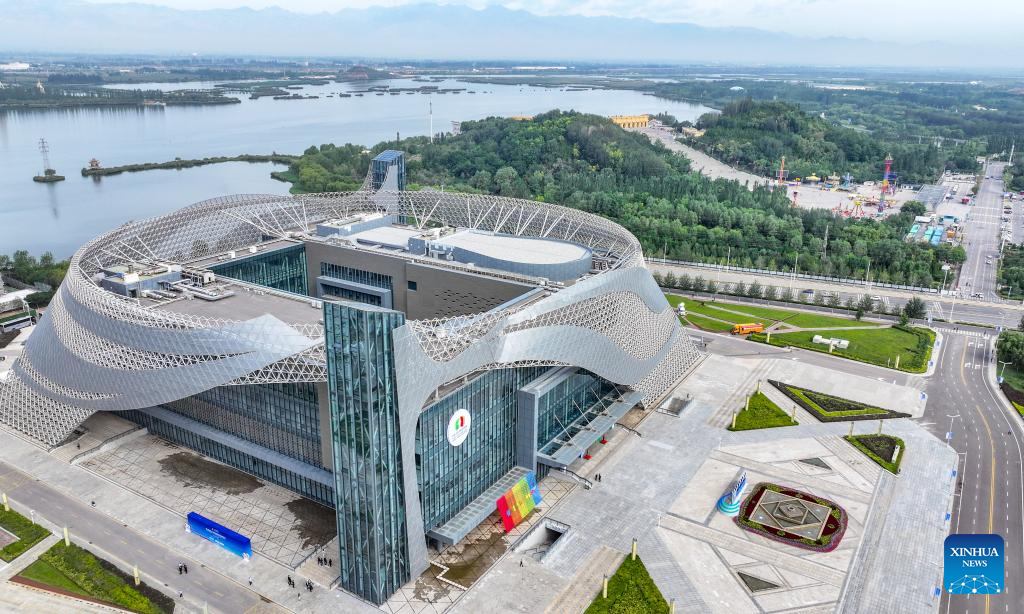 This photo taken on Aug. 28, 2025 shows an outside view of the venue of the seventh China-Arab States Expo in Yinchuan, northwest China's Ningxia Hui Autonomous Region. The seventh China-Arab States Expo kicked off on Thursday in Yinchuan, capital of northwest China's Ningxia Hui Autonomous Region, attracting more than 7,600 participants and over 2,200 enterprises and institutions from 75 countries and regions. (Xinhua/Feng Kaihua)