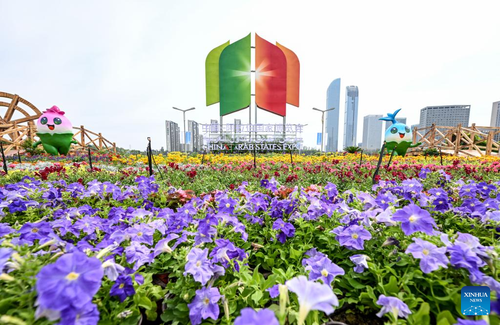 This photo taken on Aug. 28, 2025 shows a view of the seventh China-Arab States Expo in Yinchuan, northwest China's Ningxia Hui Autonomous Region. The seventh China-Arab States Expo kicked off on Thursday in Yinchuan, capital of northwest China's Ningxia Hui Autonomous Region, attracting more than 7,600 participants and over 2,200 enterprises and institutions from 75 countries and regions. (Xinhua/Feng Kaihua)