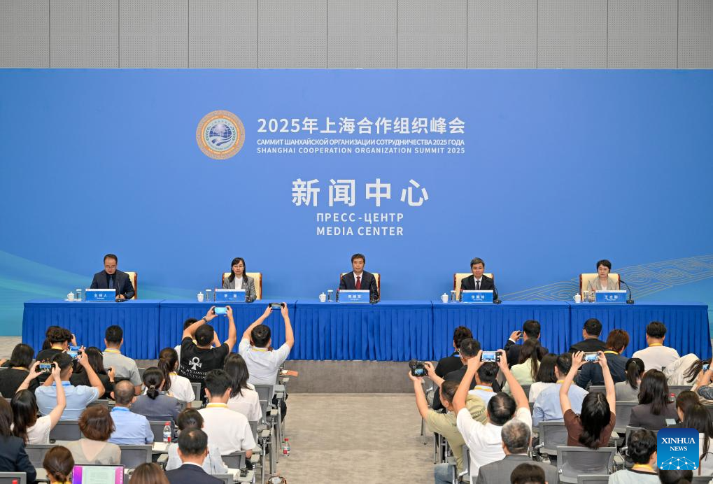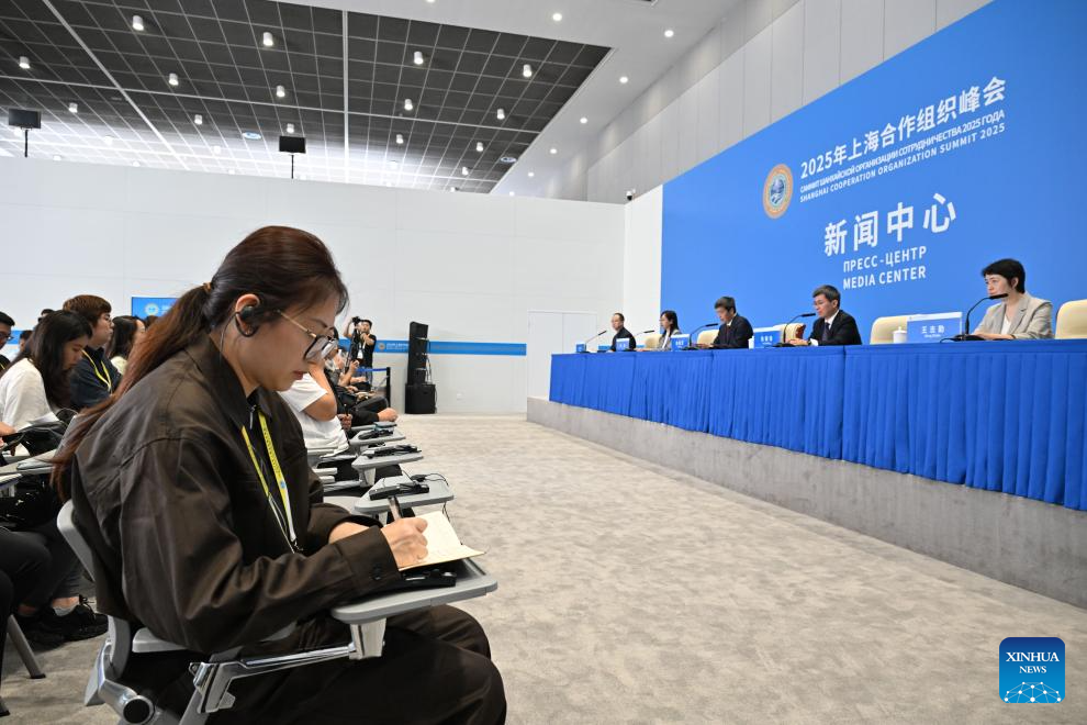 The first press conference is held by the media center for the upcoming Shanghai Cooperation Organization (SCO) Summit 2025 in north China's Tianjin on Aug. 28, 2025. (Xinhua/Sun Fanyue)