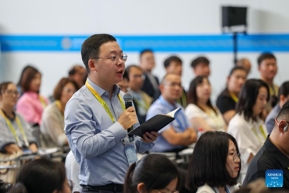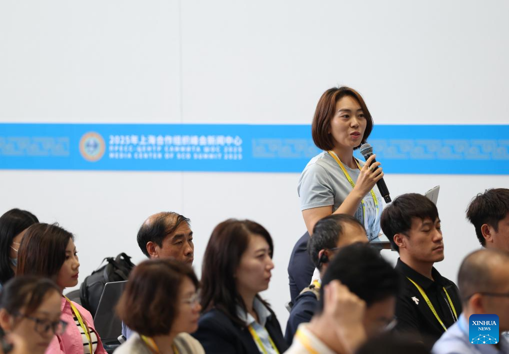 A journalist raises questions during the first press conference held at the media center for the upcoming Shanghai Cooperation Organization (SCO) Summit 2025 in north China's Tianjin, Aug. 28, 2025. (Xinhua/Sun Fanyue)