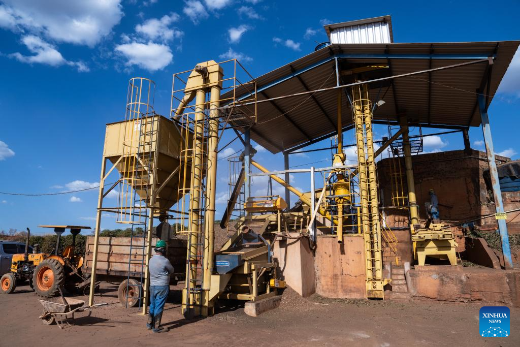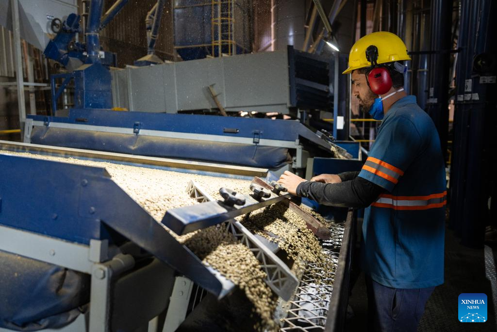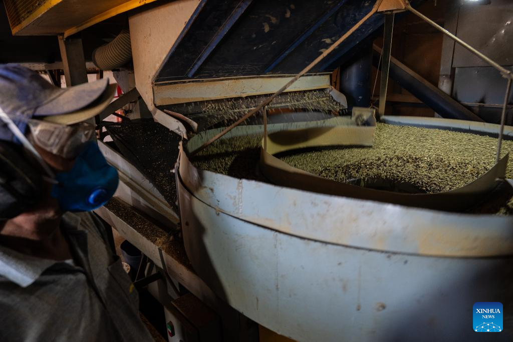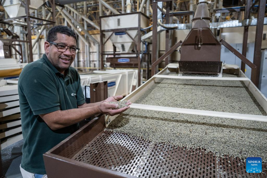 A staff member monitors the selection of coffee beans at a coffee farmer collective in a coffee producing region known as the Cerrado Mineiro, in Minas Gerais state, Brazil, Aug. 26, 2025. Brazil is one of the world's largest coffee producers. The Cerrado Mineiro region in Minas Gerais state has a total planting area of about 210,000 hectares, producing an average of 5 million bags of coffee annually, which accounts for approximately 13 percent of the country's total output. (Xinhua/Wang Tiancong)