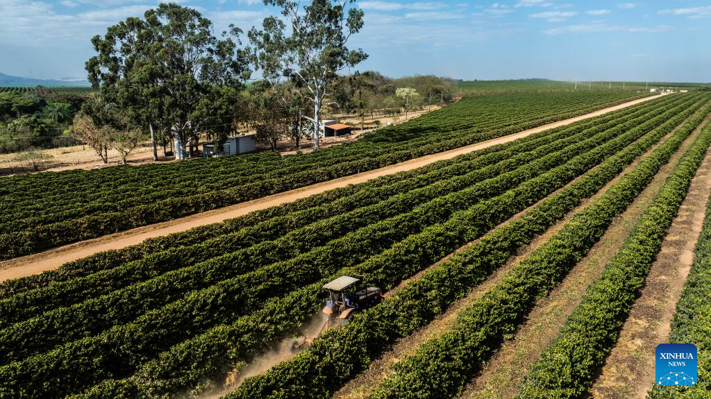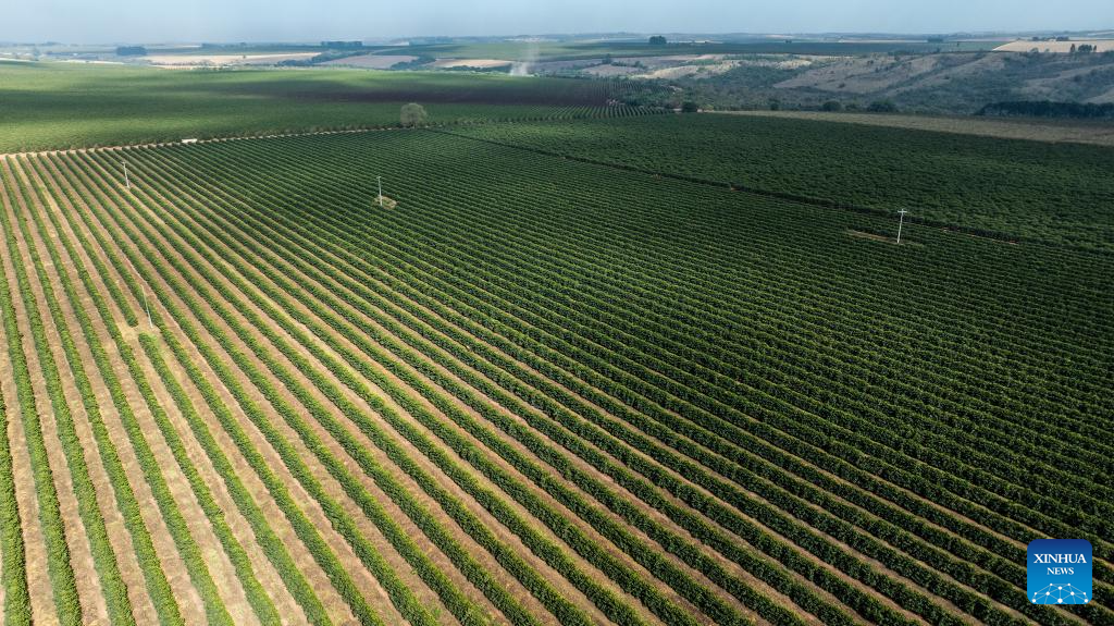 An aerial drone photo taken on Aug. 26, 2025 shows coffee trees at a coffee manor in a coffee producing region known as the Cerrado Mineiro, in Minas Gerais state, Brazil. Brazil is one of the world's largest coffee producers. The Cerrado Mineiro region in Minas Gerais state has a total planting area of about 210,000 hectares, producing an average of 5 million bags of coffee annually, which accounts for approximately 13 percent of the country's total output. (Xinhua/Wang Tiancong)