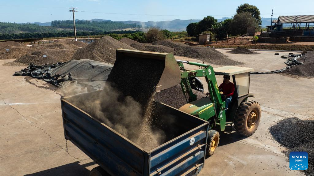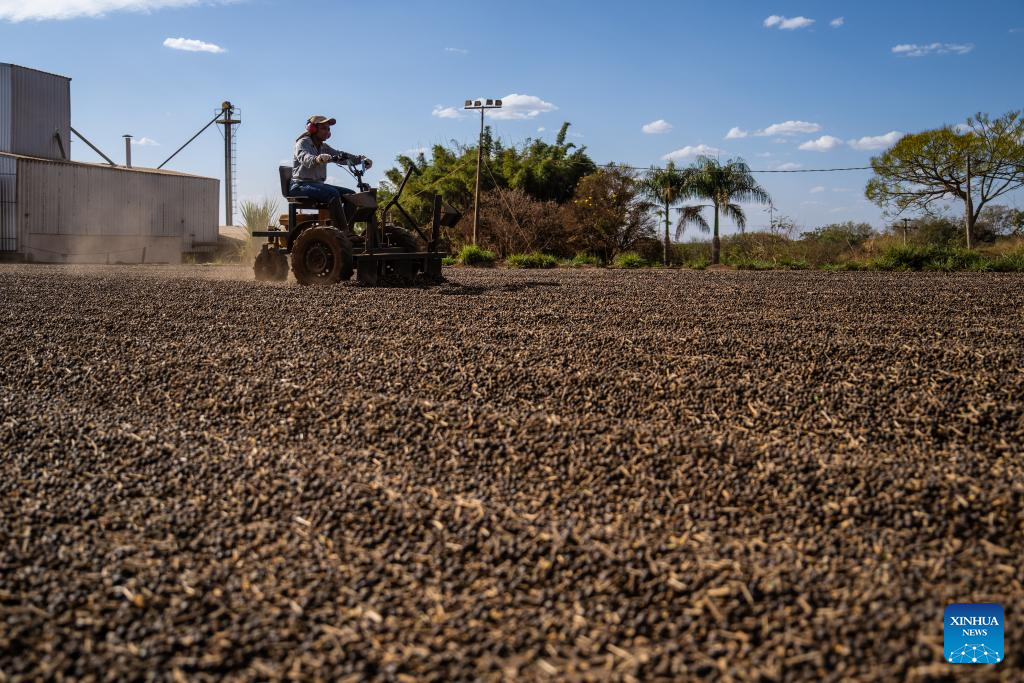 A staff member operates machinery to turnover aired coffee beans at a coffee manor in a coffee producing region known as the Cerrado Mineiro, in Minas Gerais state, Brazil, Aug. 27, 2025. Brazil is one of the world's largest coffee producers. The Cerrado Mineiro region in Minas Gerais state has a total planting area of about 210,000 hectares, producing an average of 5 million bags of coffee annually, which accounts for approximately 13 percent of the country's total output. (Xinhua/Wang Tiancong)