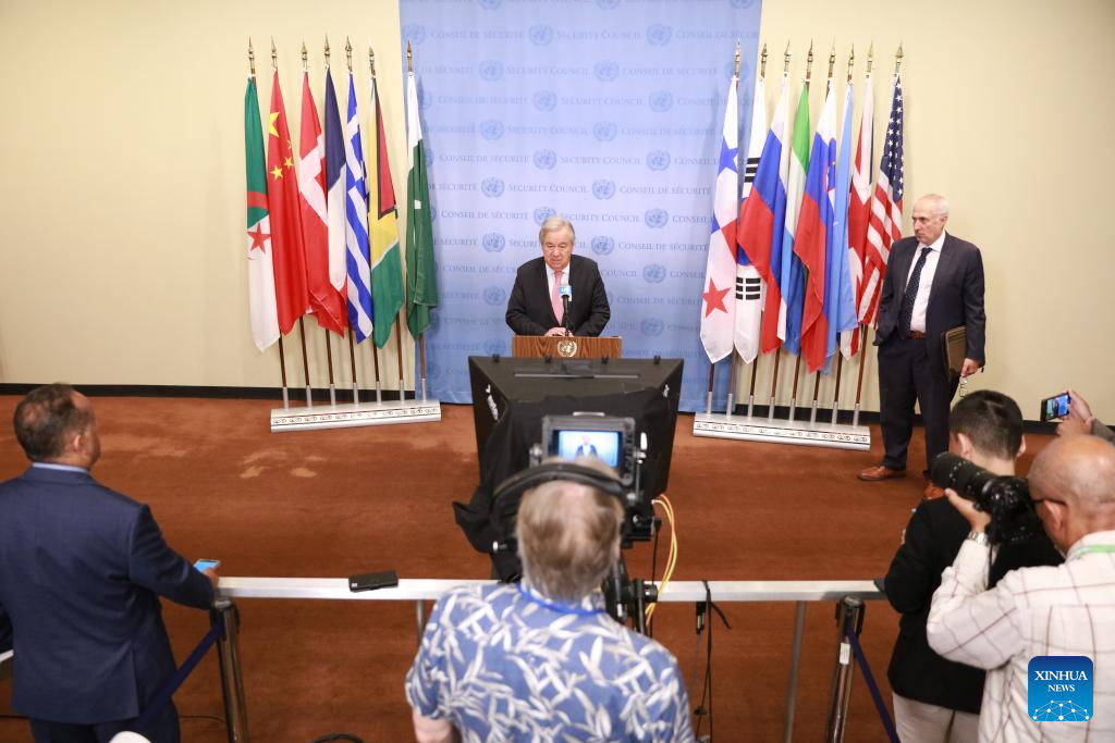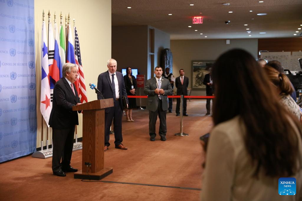 UN Secretary-General Antonio Guterres speaks to the press outside the Security Council Chamber at the UN headquarters in New York, Aug. 28, 2025. Guterres said Thursday that Israel's initial steps to militarily take over Gaza City signal a new and dangerous phase with devastating consequences. (Xinhua/Xie E)