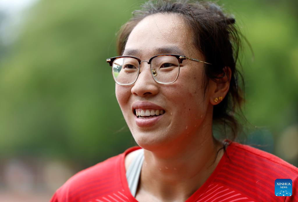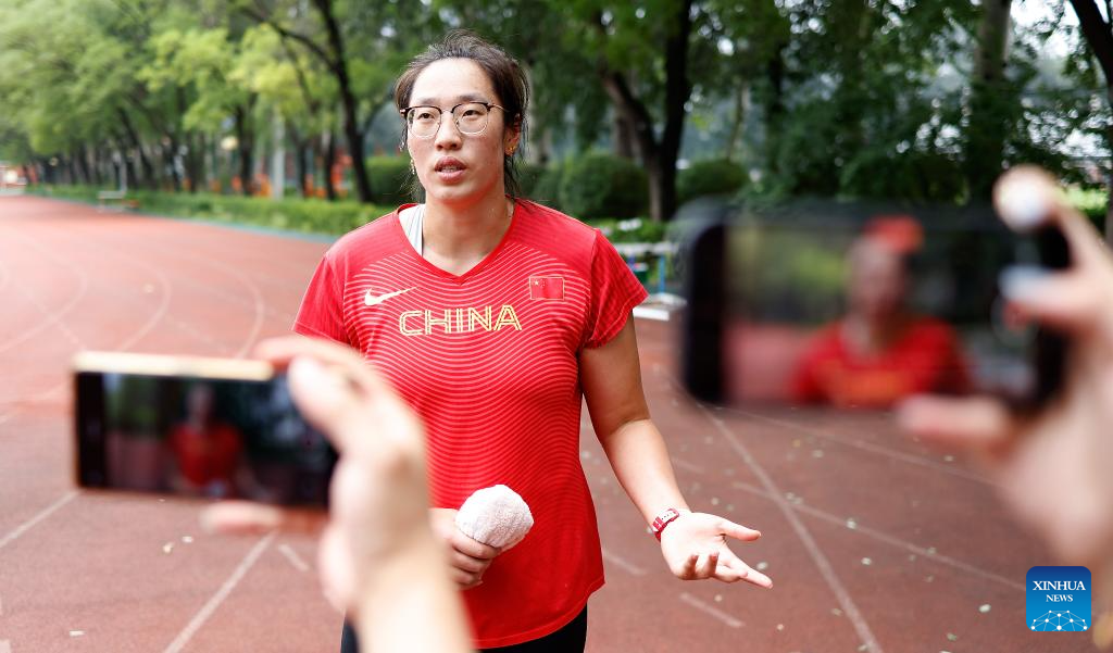 Chinese discus thrower Feng Bin is interviewed by reporters after a training session at Beijing Sport University in Beijing, China, Aug. 29, 2025. (Xinhua/Wang Lili)