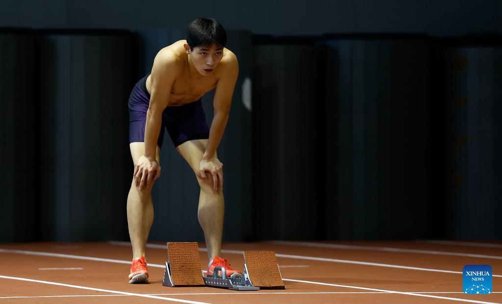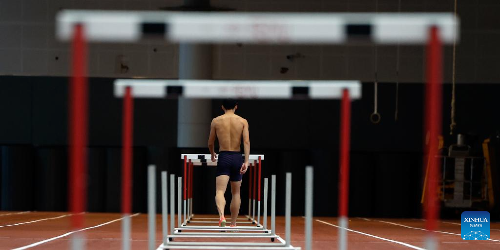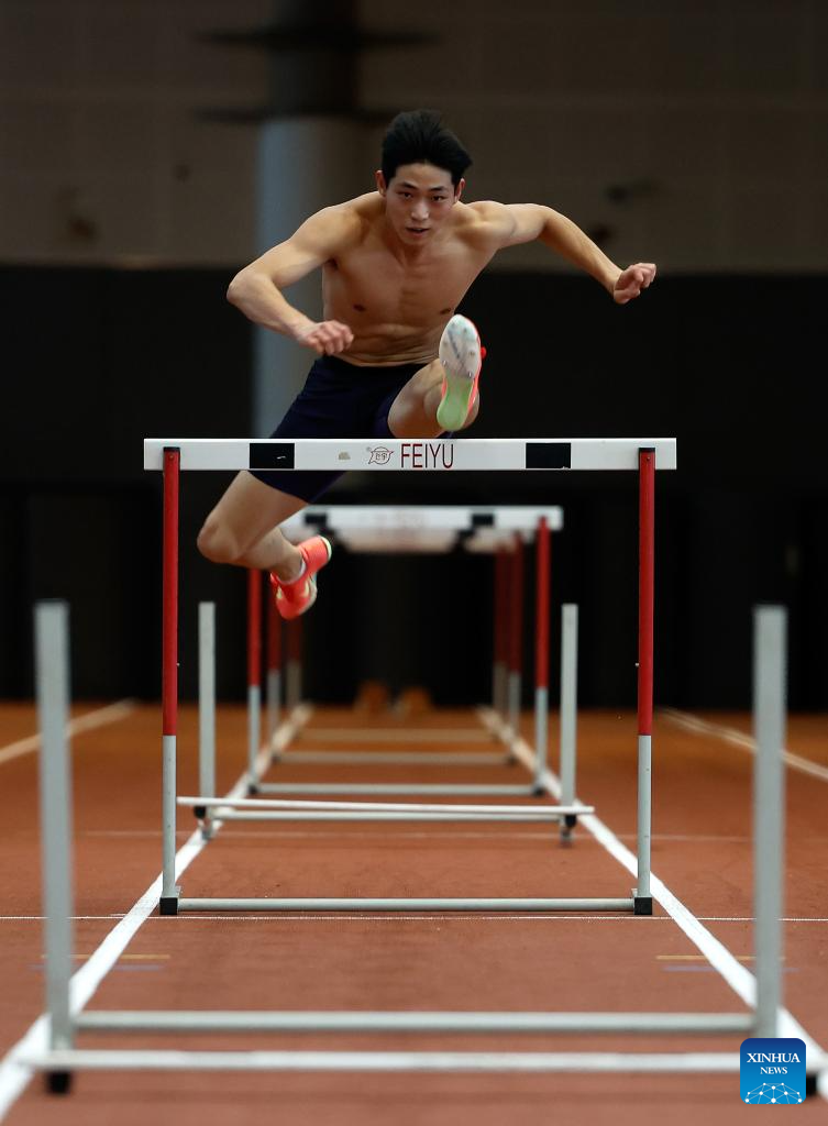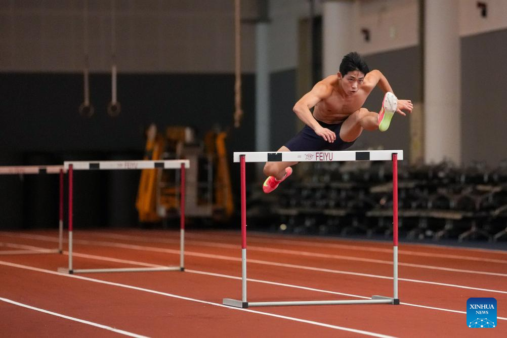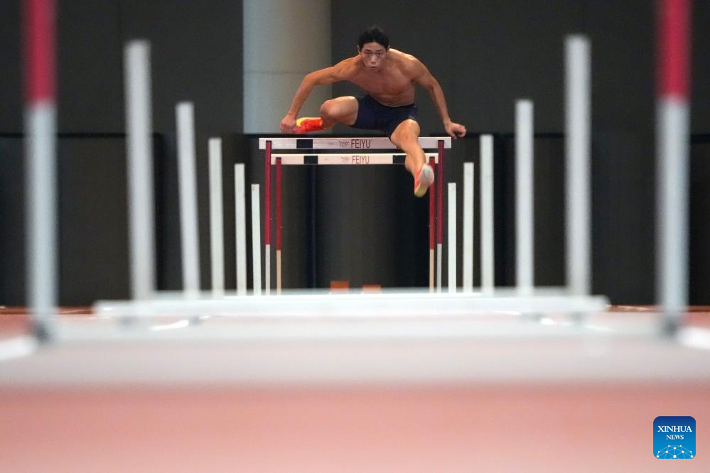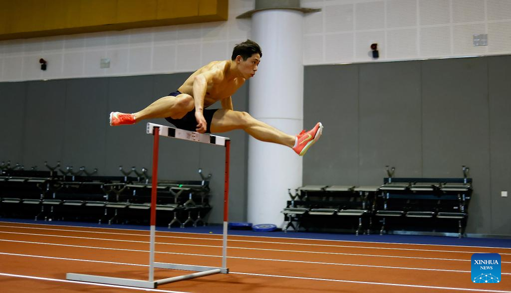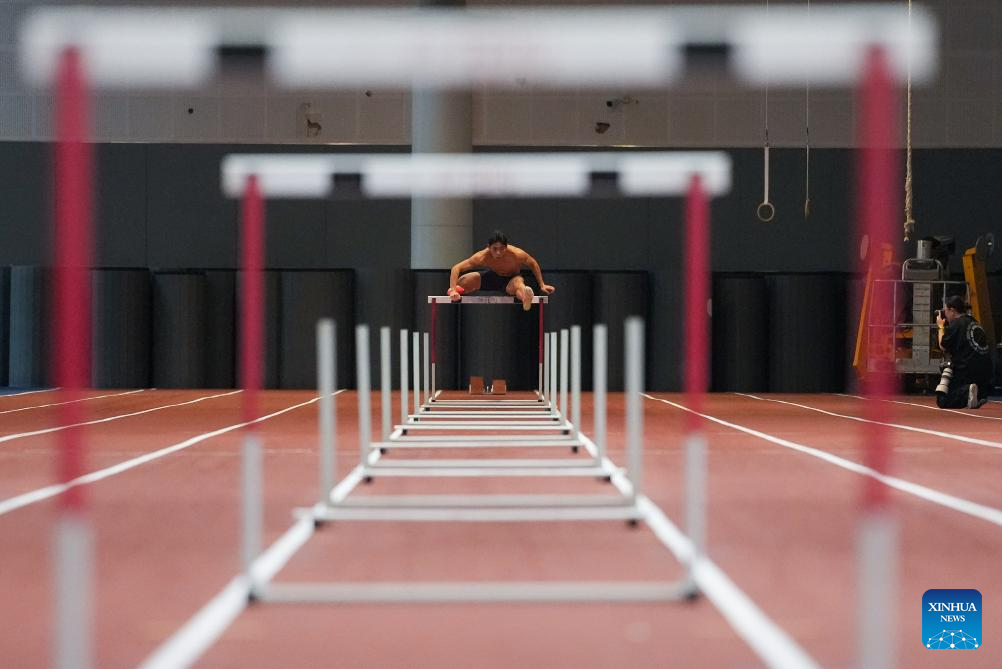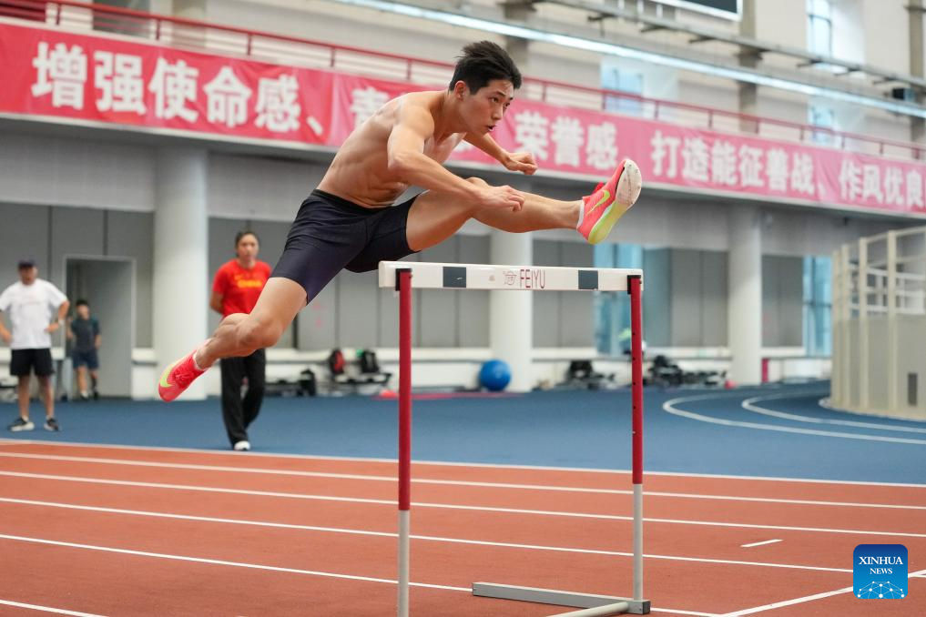 Chinese 110m hurdler Liu Junxi takes a training session at Beijing Sport University in Beijing, China, Aug. 29, 2025. (Xinhua/Wang Lili)