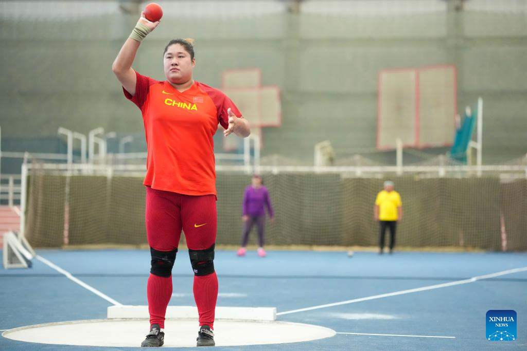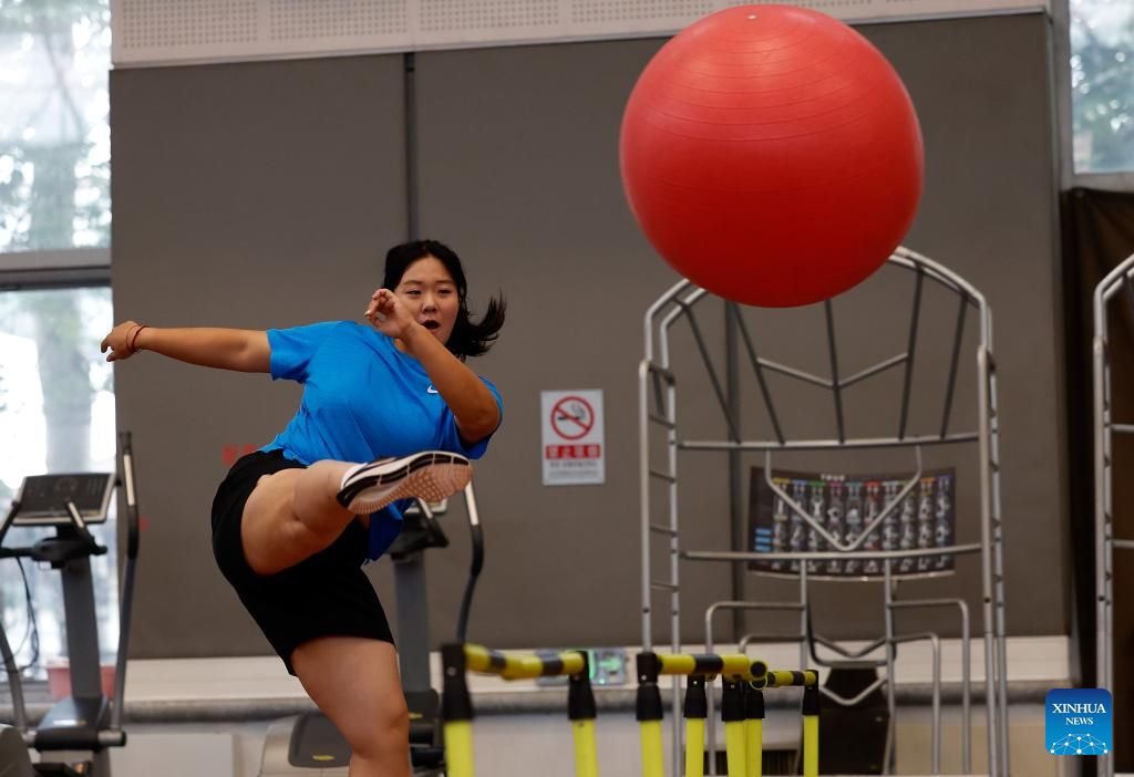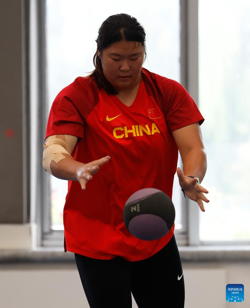 Chinese shot putter Zhang Linru takes a training session at Beijing Sport University in Beijing, China, Aug. 29, 2025. (Xinhua/Ju Huanzong)