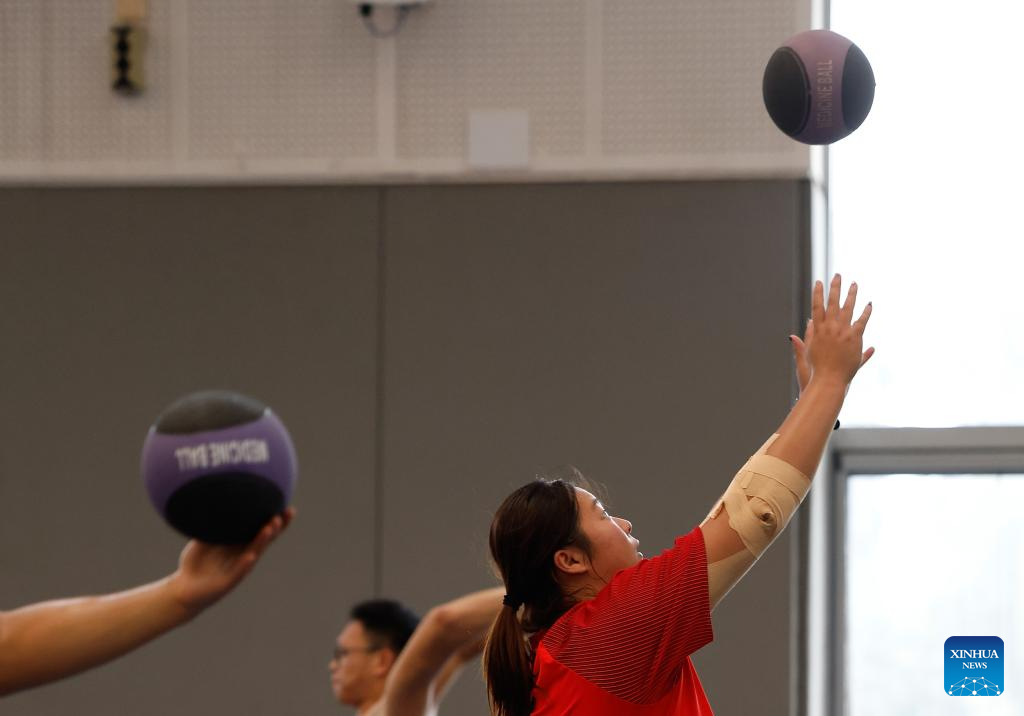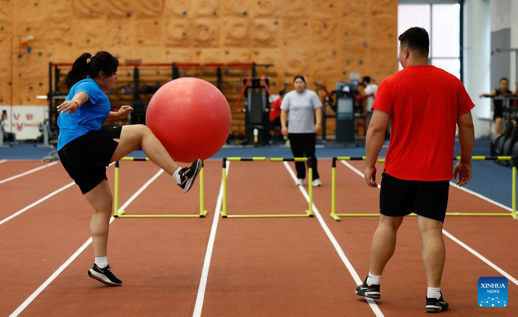 Chinese shot putter Xing Jialiang takes a training session at Beijing Sport University in Beijing, China, Aug. 29, 2025. (Xinhua/Wang Lili)