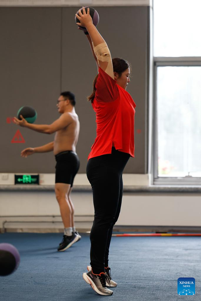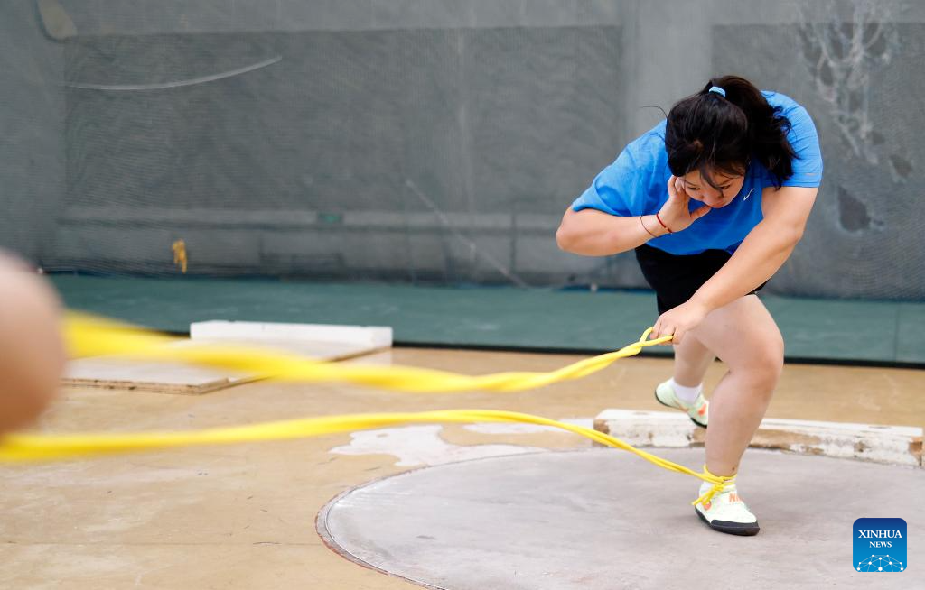Chinese shot putter Sun Yue takes a training session at Beijing Sport University in Beijing, China, Aug. 29, 2025. (Xinhua/Wang Lili)