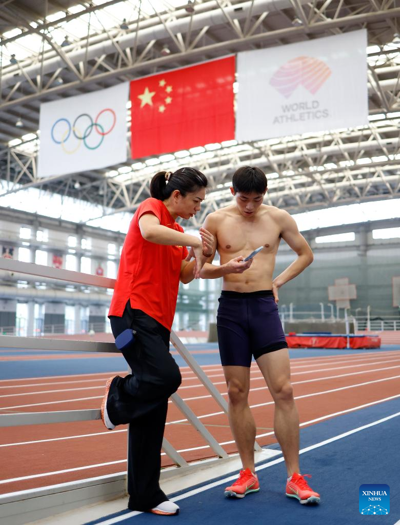 Chinese 110m hurdler Liu Junxi (R) and his coach Su Yiping review the training video during a training session at Beijing Sport University in Beijing, China, Aug. 29, 2025. (Xinhua/Wang Lili)