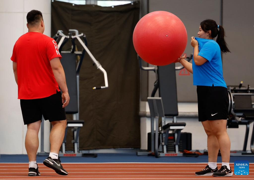 Chinese shot putters Sun Yue (L) and Xing Jialiang take a training session at Beijing Sport University in Beijing, China, Aug. 29, 2025. (Xinhua/Wang Lili)