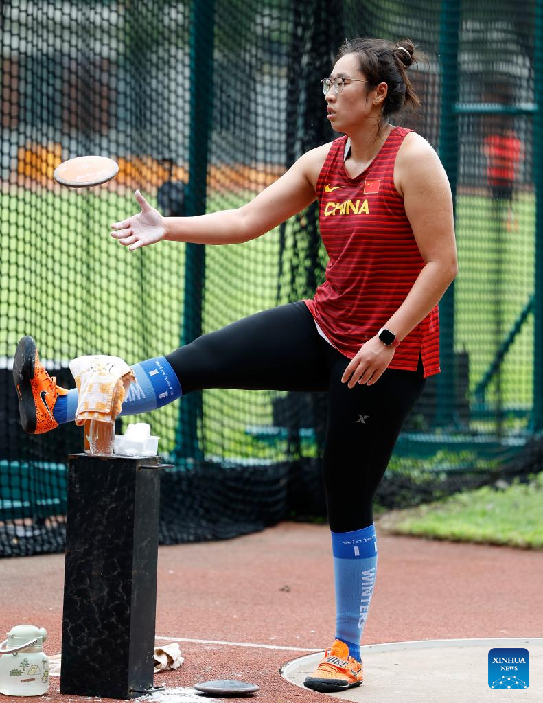Chinese discus thrower Feng Bin takes a training session at Beijing Sport University in Beijing, China, Aug. 29, 2025. (Xinhua/Ju Huanzong)