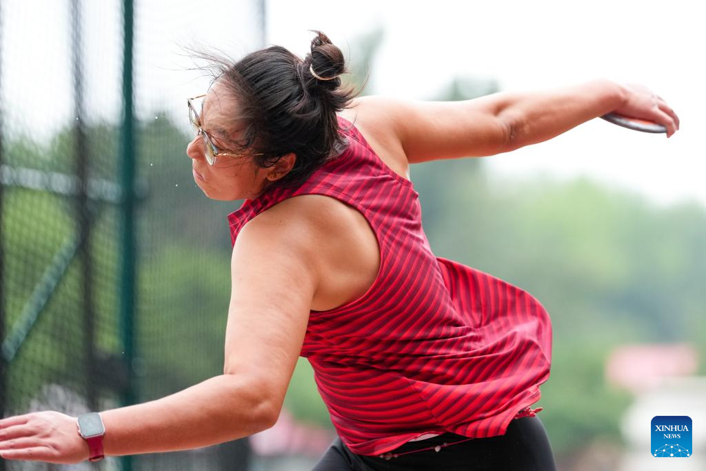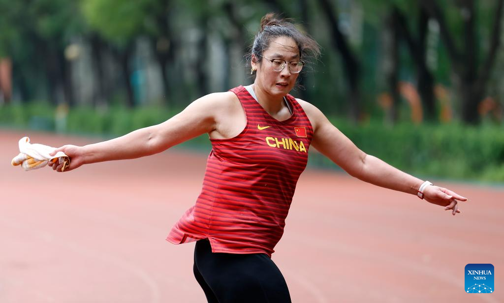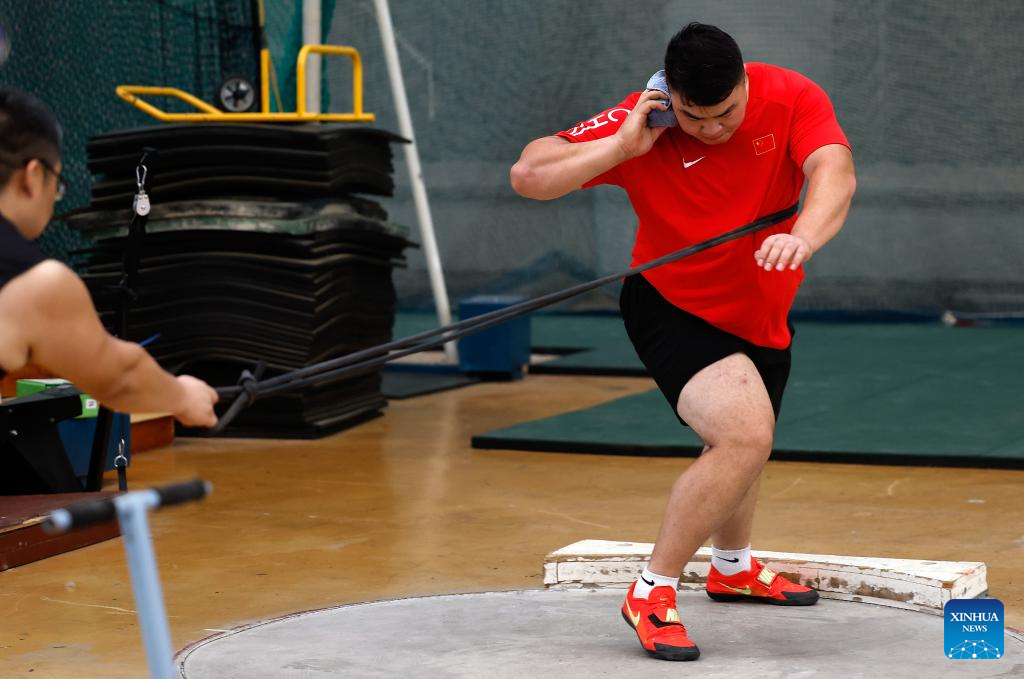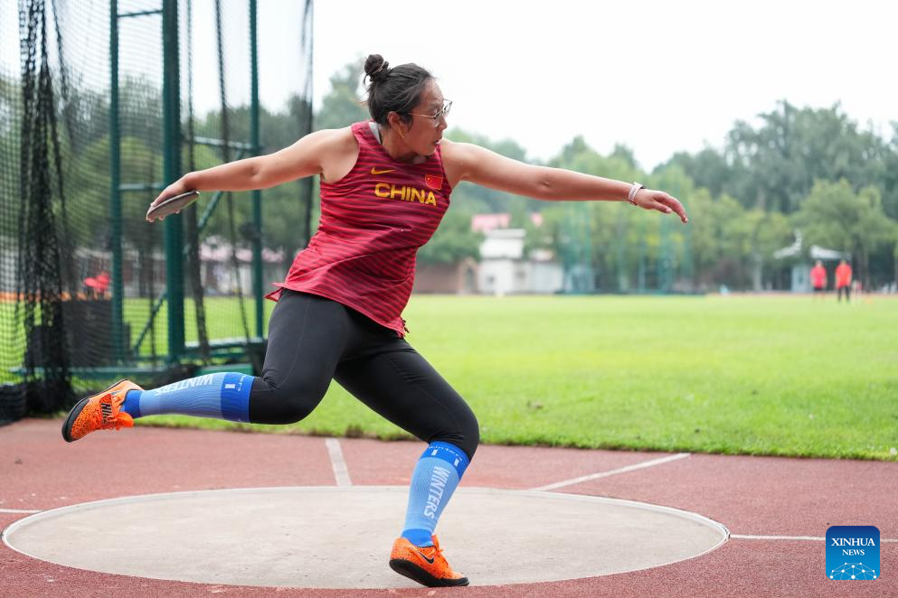 Chinese discus thrower Feng Bin takes a training session at Beijing Sport University in Beijing, China, Aug. 29, 2025. (Xinhua/Wang Lili)