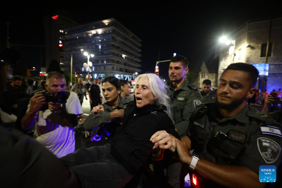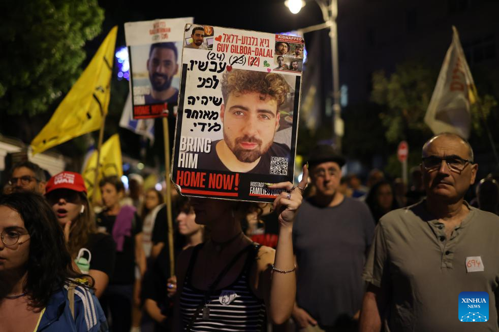 People attend a protest calling for an immediate ceasefire and the release of Israeli hostages held in Gaza, near the Israeli Prime Minister's Office in Jerusalem, on Aug. 30, 2025. Israel's military spokesman Avichay Adraee said on Friday that the Israeli military has begun the preliminary operations and initial stages of the attack on Gaza City, and is operating with great intensity on the outskirts of the city. (Photo by Jamal Awad/Xinhua)