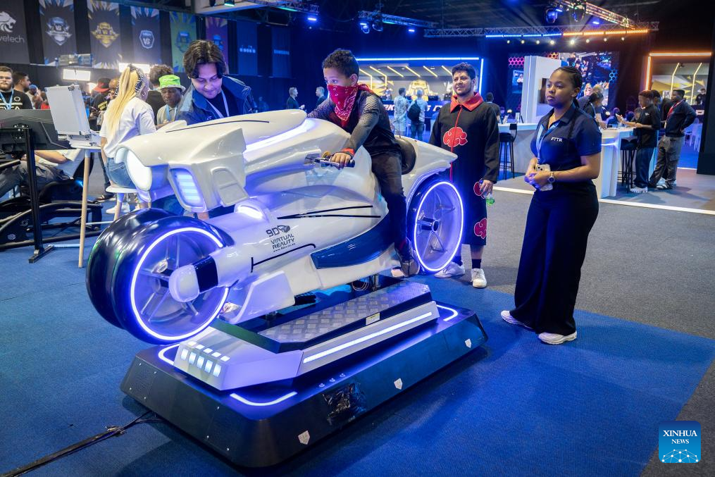 A visitor tries a gaming device at the Comic Con Africa in Johannesburg, South Africa, Aug. 28, 2025. The event is held here from Aug. 28 to 31. (Photo by Shiraaz Mohamed/Xinhua)