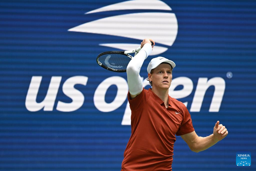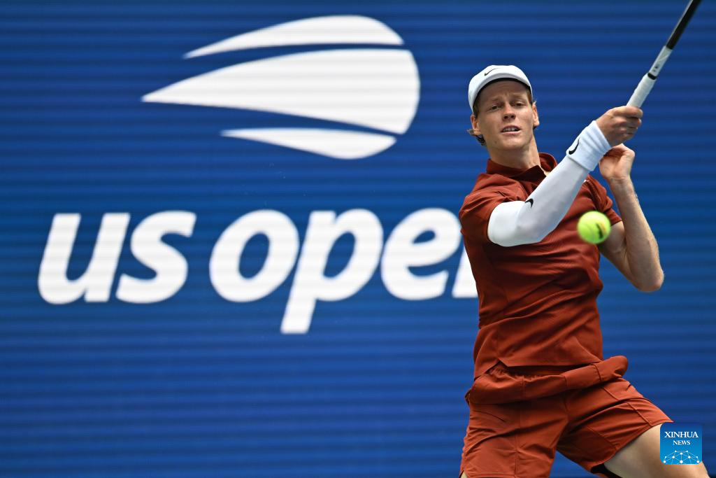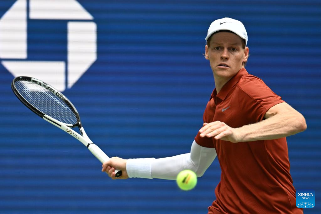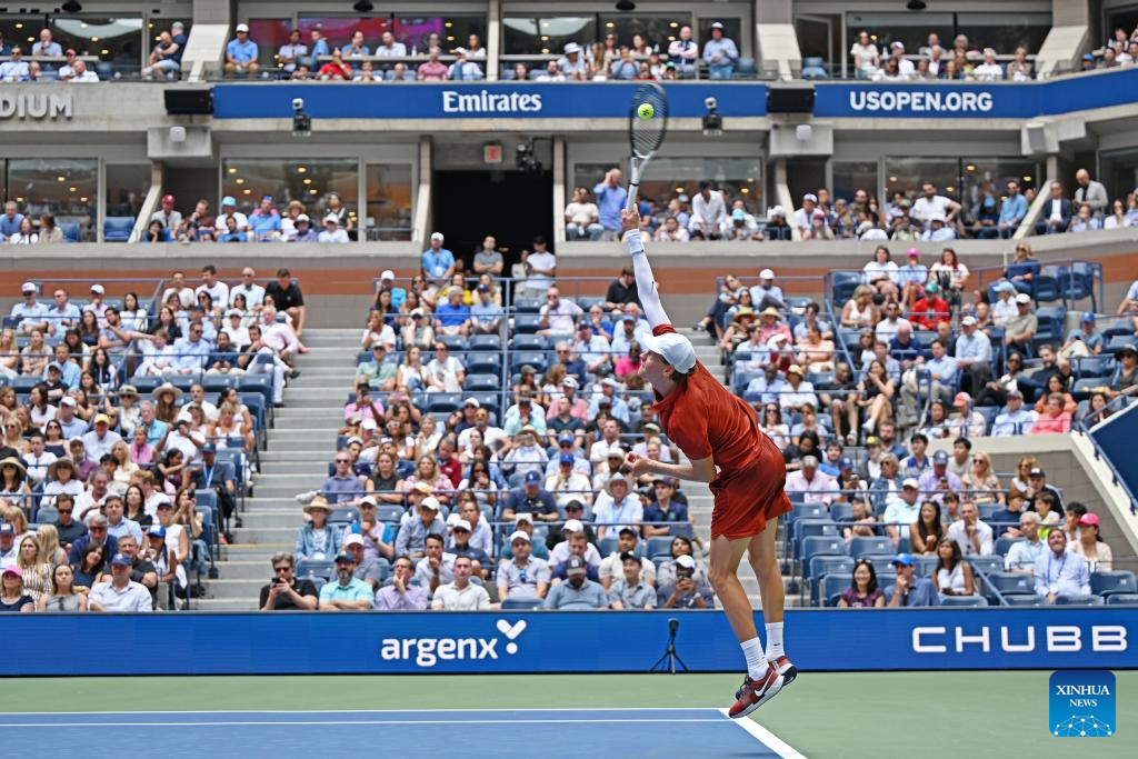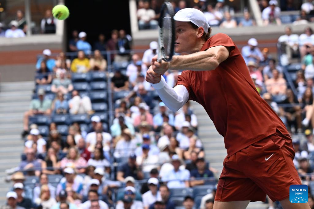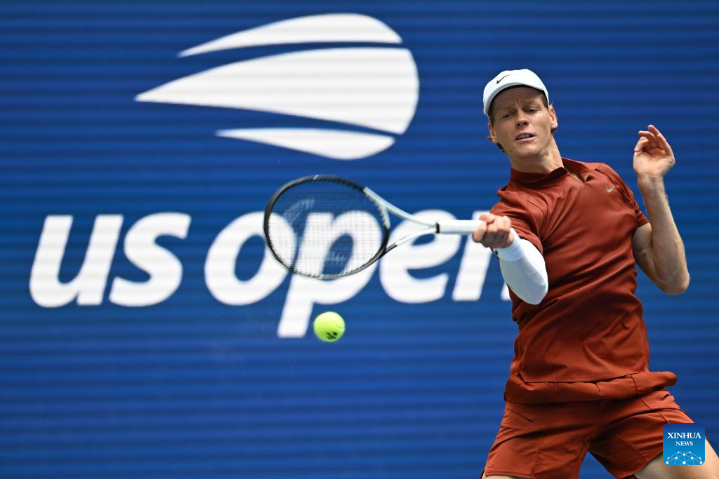 Jannik Sinner competes during the men's singles second round match between Jannik Sinner of Italy and Alexei Popyrin of Australia at the 2025 US Open tennis championships in New York, the United States, on Aug. 28, 2025. (Xinhua/Li Rui)