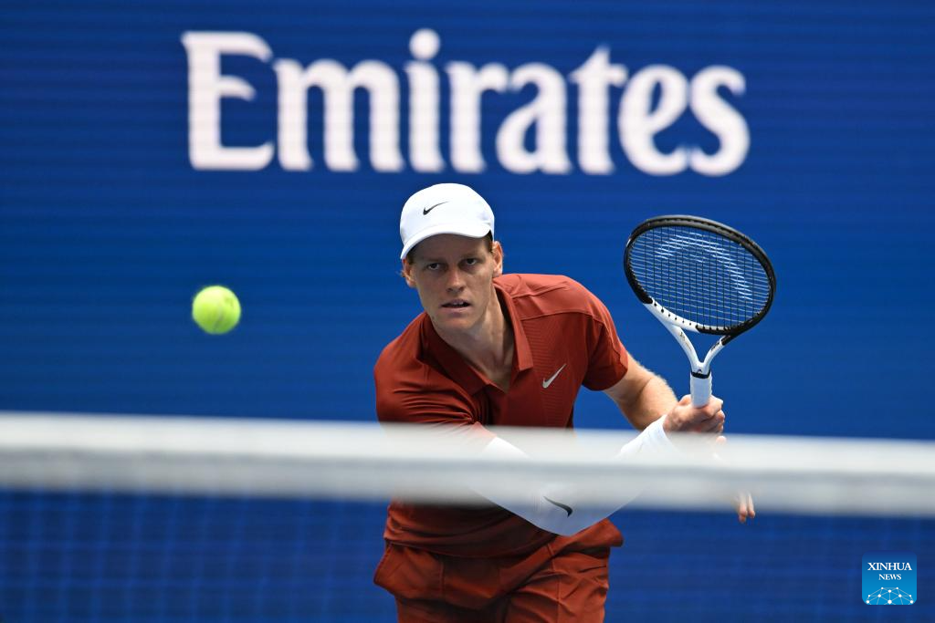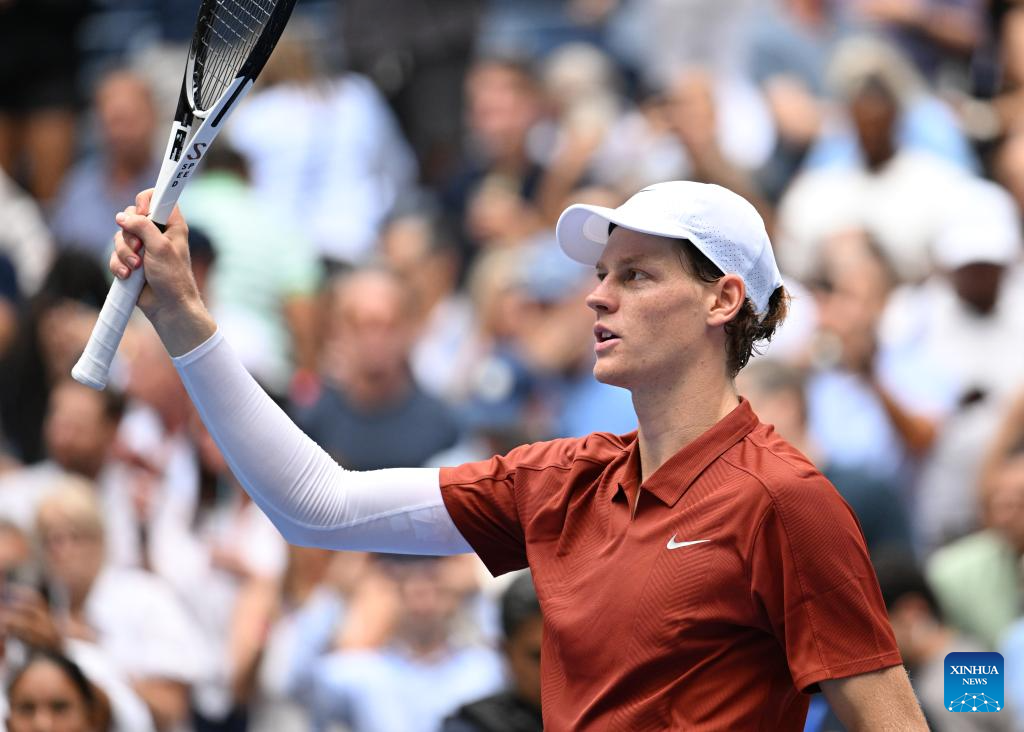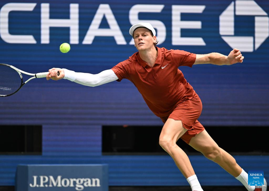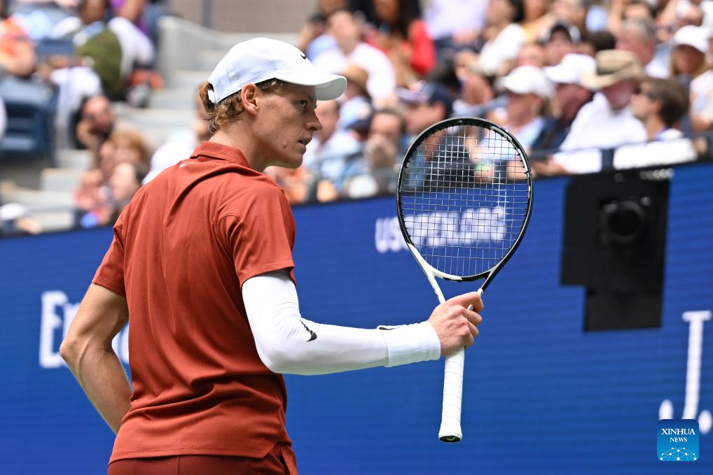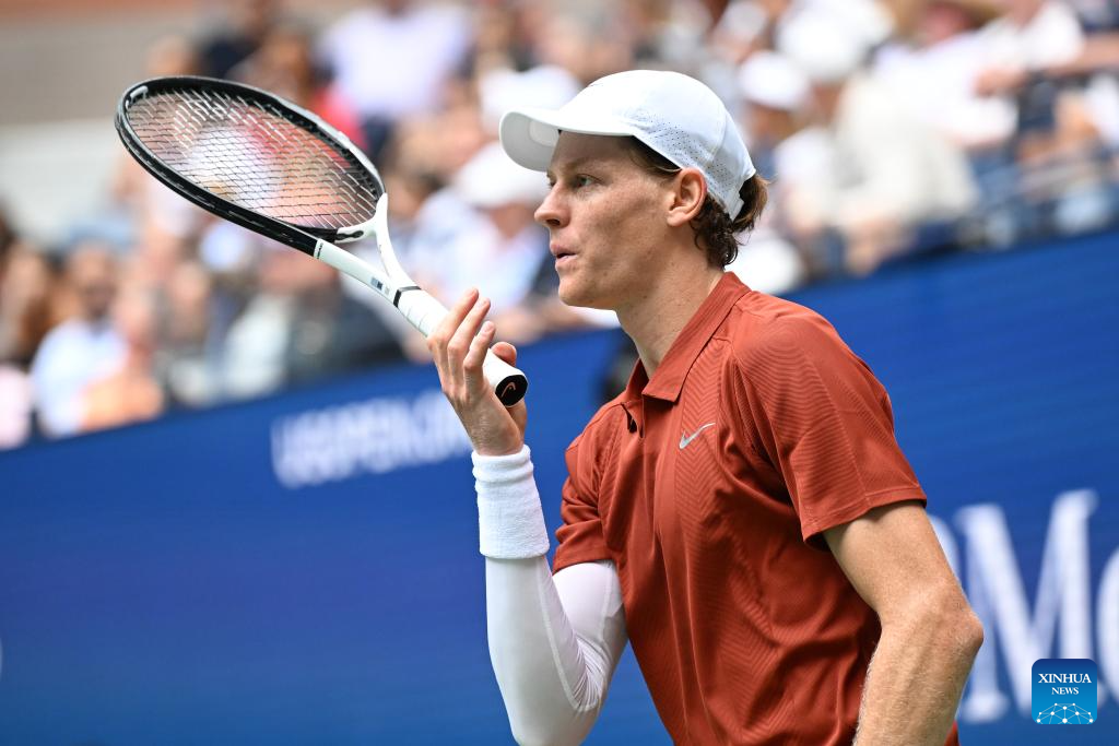 Jannik Sinner competes during the men's singles second round match between Jannik Sinner of Italy and Alexei Popyrin of Australia at the 2025 US Open tennis championships in New York, the United States, on Aug. 28, 2025. (Xinhua/Li Rui)
