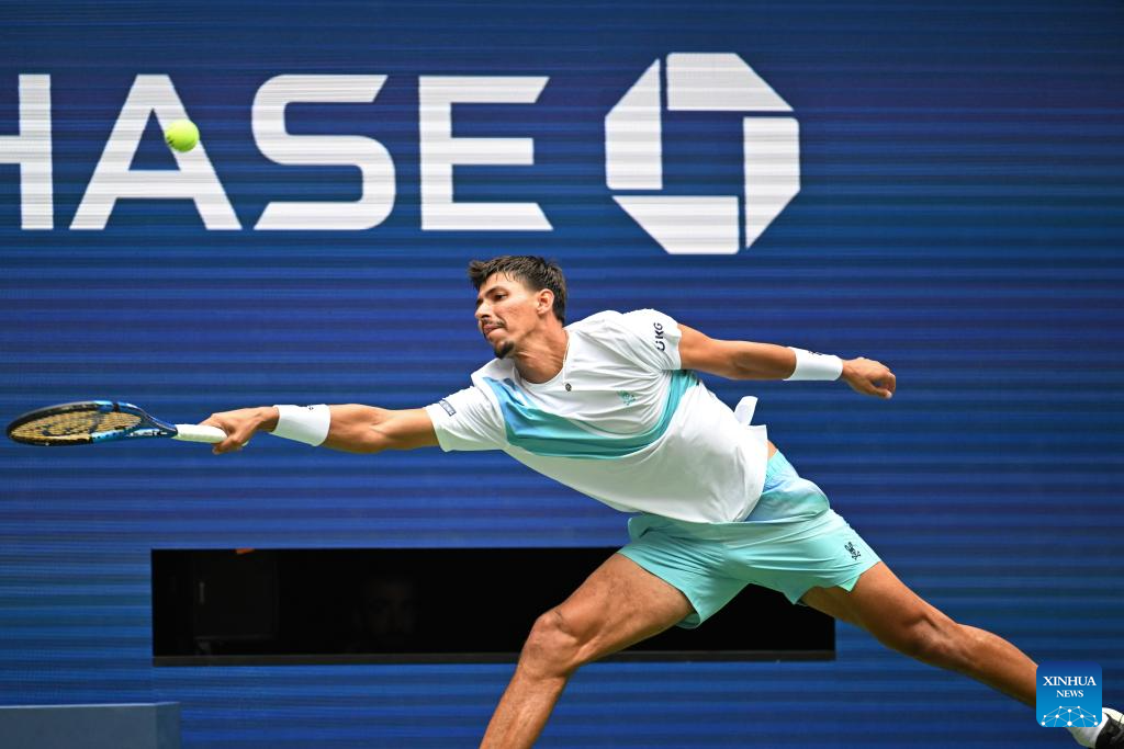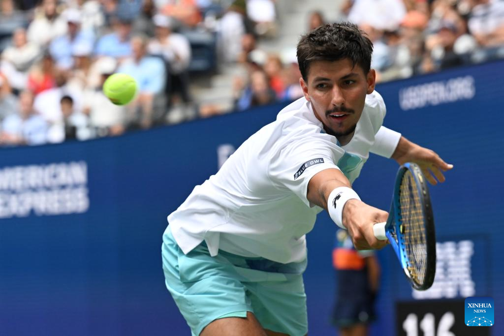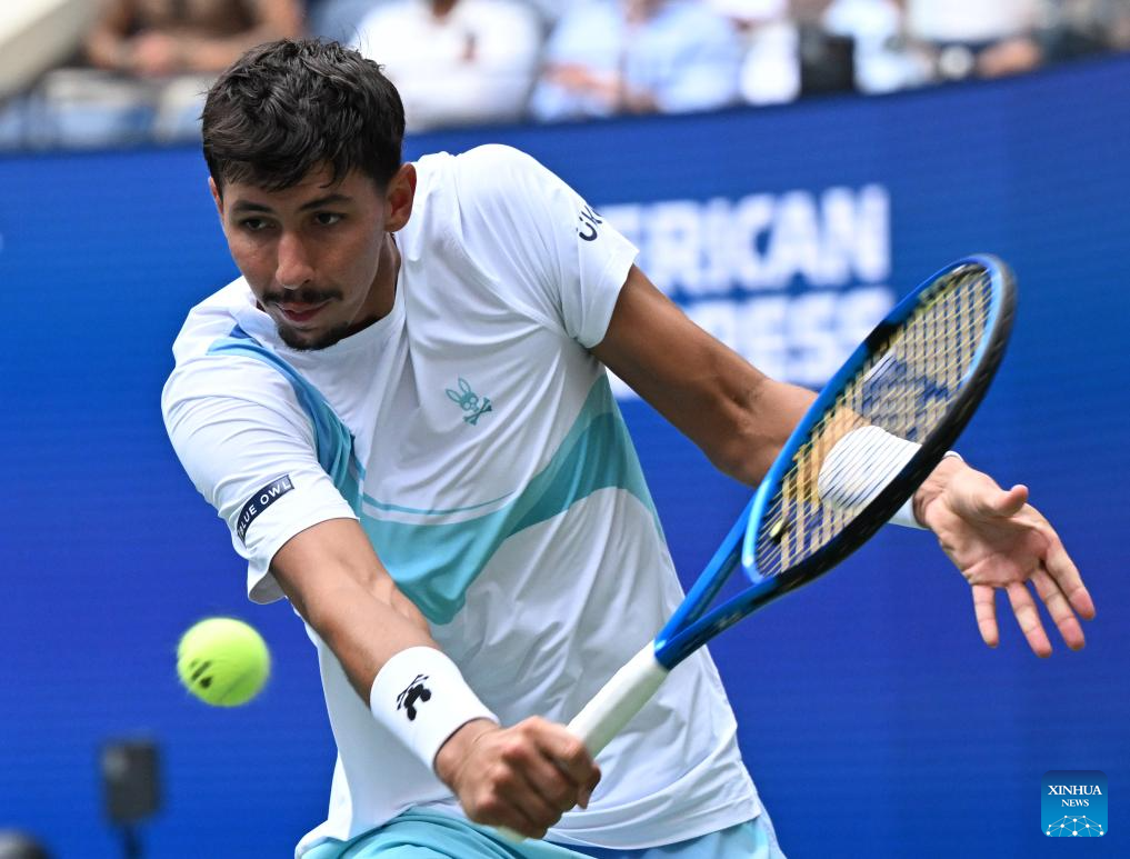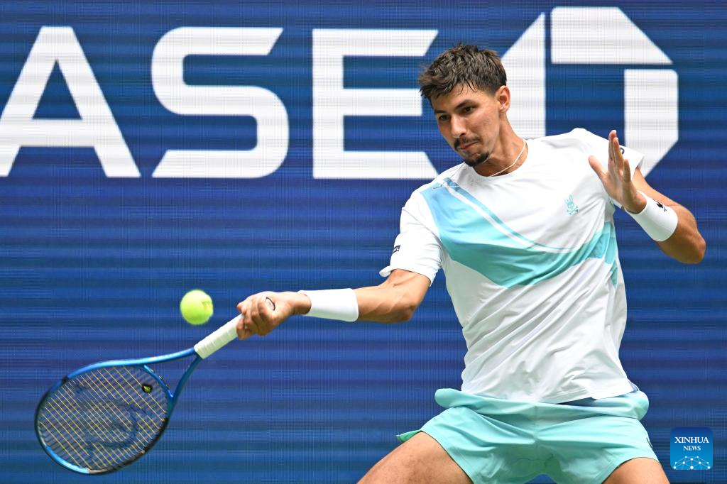 Alexei Popyrin hits a return during the men's singles second round match between Jannik Sinner of Italy and Alexei Popyrin of Australia at the 2025 US Open tennis championships in New York, the United States, on Aug. 28, 2025. (Xinhua/Li Rui)