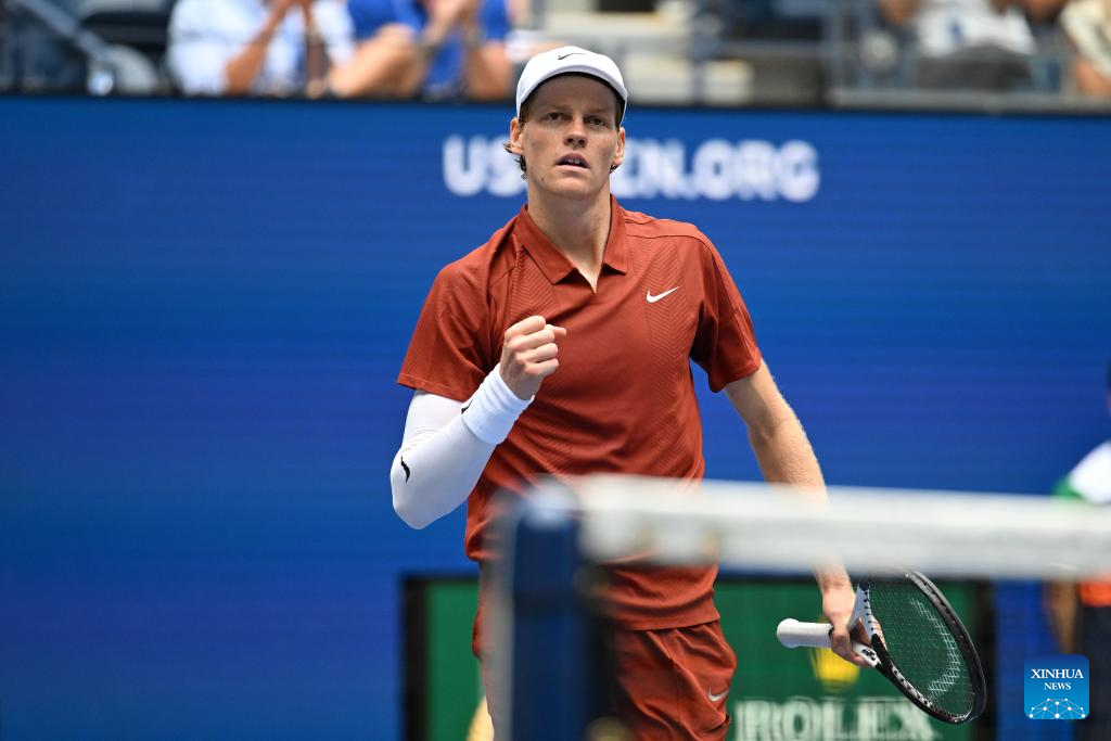 Jannik Sinner celebrates scoring during the men's singles second round match between Jannik Sinner of Italy and Alexei Popyrin of Australia at the 2025 US Open tennis championships in New York, the United States, on Aug. 28, 2025. (Xinhua/Li Rui)
