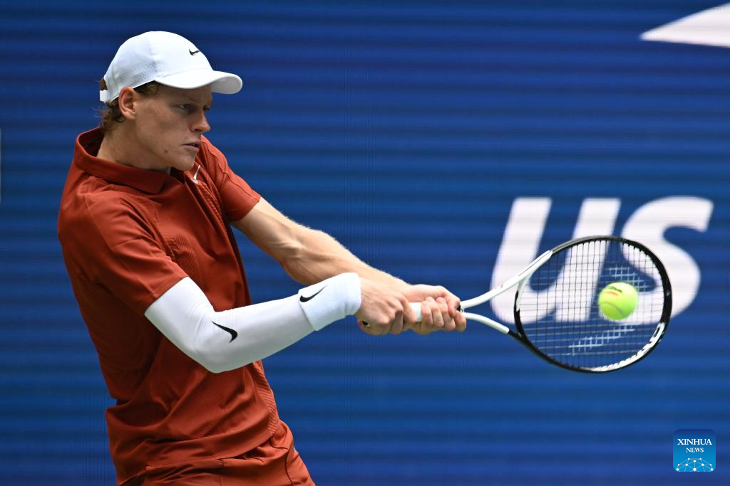 Jannik Sinner hits a return during the men's singles second round match between Jannik Sinner of Italy and Alexei Popyrin of Australia at the 2025 US Open tennis championships in New York, the United States, on Aug. 28, 2025. (Xinhua/Li Rui)