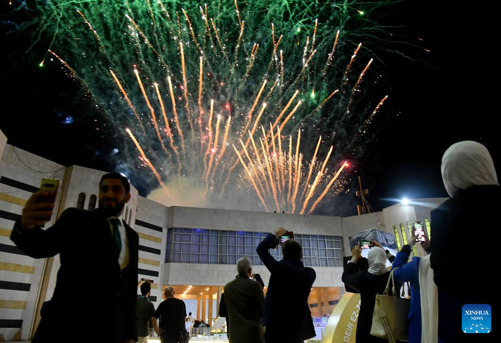 Fireworks light up the night sky during the opening ceremony of the 62nd Damascus International Fair at the Damascus International Fairgrounds, in the southern countryside of Damascus, Syria, on Aug. 27, 2025. The fair runs from Aug. 27 to Sept. 5. (Photo by Ammar Safarjalani/Xinhua)