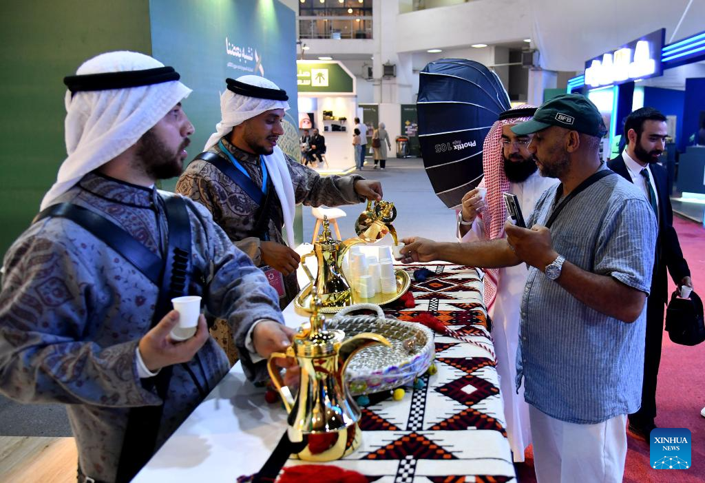 Exhibitors serve Arabic coffee to visitors at the 62nd Damascus International Fair in Damascus, Syria, on Aug. 27, 2025. The fair runs from Aug. 27 to Sept. 5. (Photo by Ammar Safarjalani/Xinhua)