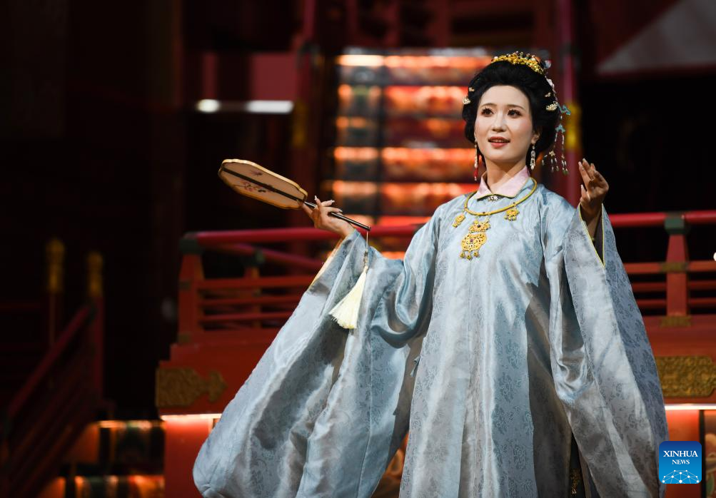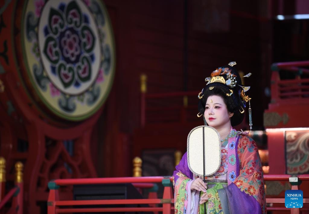 An actress performs to display traditional costumes at a theme block in Xi'an, northwest China's Shaanxi Province, Aug. 29, 2025. (Xinhua/Zhang Bowen)