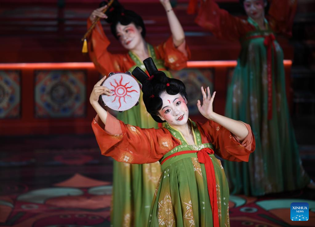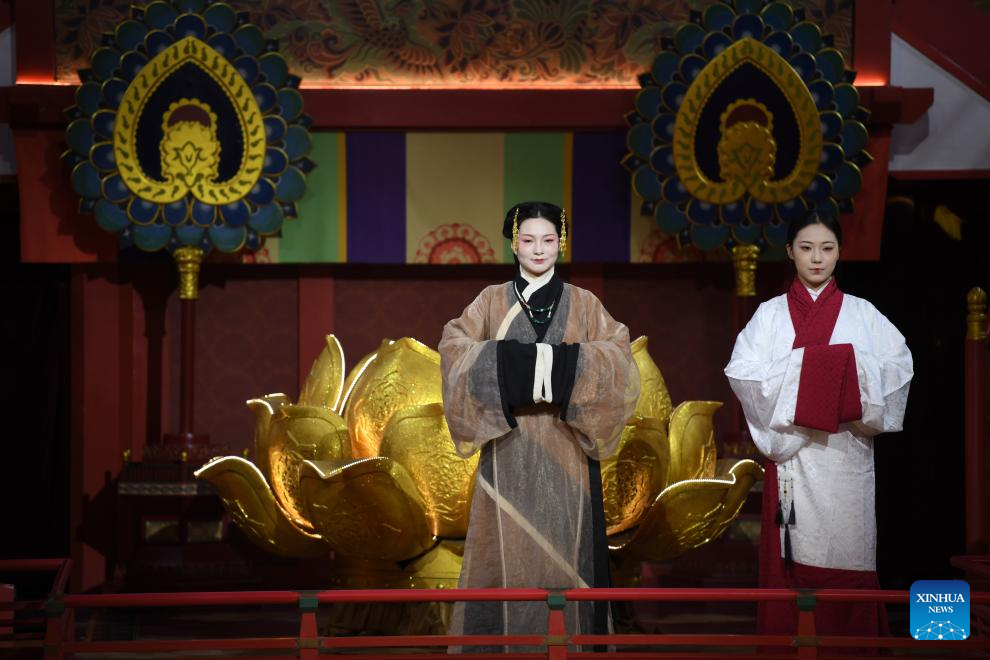 Actresses perform to display traditional costumes at a theme block in Xi'an, northwest China's Shaanxi Province, Aug. 29, 2025. (Xinhua/Zhang Bowen)