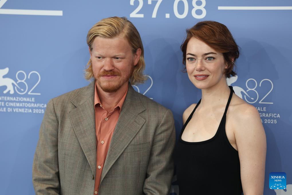 Jesse Plemons (L) and Emma Stone of the film "Bugonia" pose for the photocall during the 82nd Venice Film Festival in Venice, Italy, Aug. 28, 2025. (Xinhua/Li Jing)
