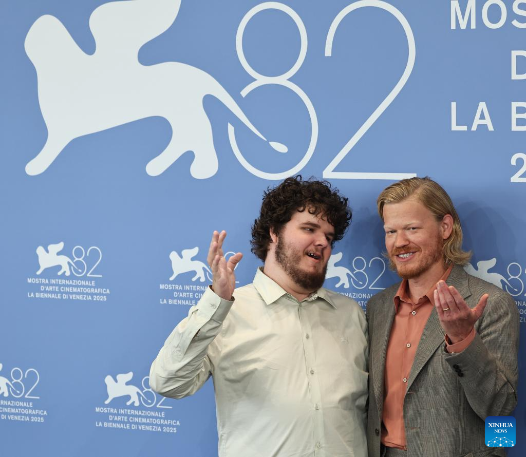 Aidan Delbis (L) and Jesse Plemons of the film "Bugonia" pose for the photocall during the 82nd Venice Film Festival in Venice, Italy, Aug. 28, 2025. (Xinhua/Li Jing)