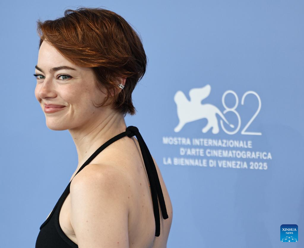 Emma Stone of the film "Bugonia" poses for the photocall during the 82nd Venice Film Festival in Venice, Italy, Aug. 28, 2025. (Xinhua/Li Jing)