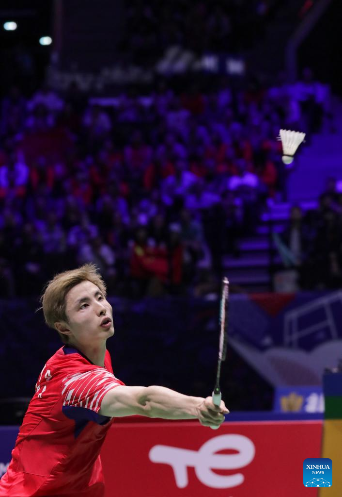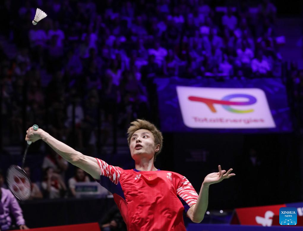 Shi Yuqi competes during the men's singles third round match between Shi Yuqi of China and Christo Popov of France at the BWF World Championships 2025 in Paris, France, Aug. 28, 2025. (Xinhua/Zhang Fan)