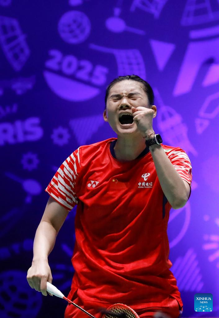 Han Yue of China celebrates victory after the women's singles third round match between Han Yue of China and Gao Fangjie of China at the BWF World Championships 2025 in Paris, France, Aug. 28, 2025. (Xinhua/Zhang Fan)