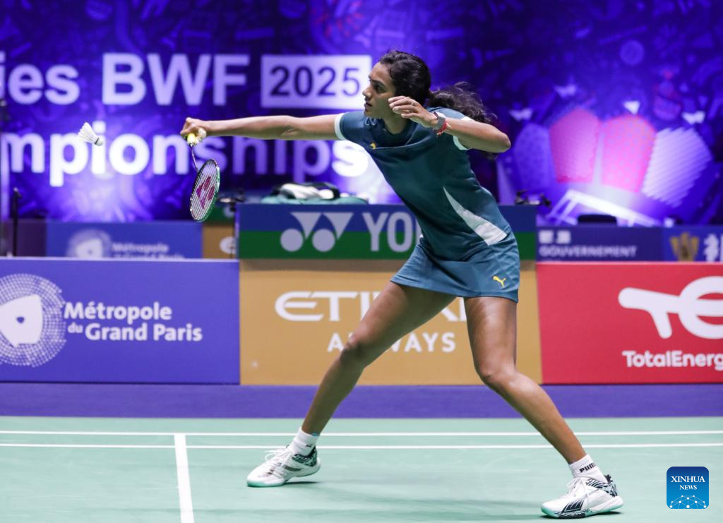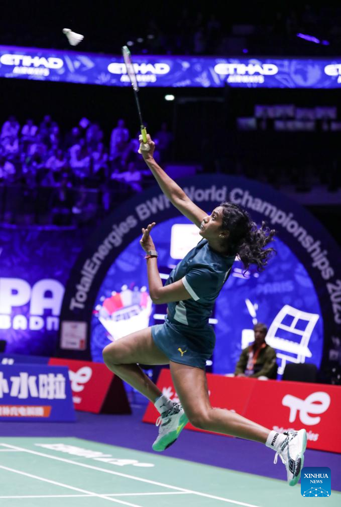 Pusarla V. Sindhu of India competes during the women's singles third round match between Wang Zhiyi of China and Pusarla V. Sindhu of India at the BWF World Championships 2025 in Paris, France, Aug. 28, 2025. (Xinhua/Zhang Fan)